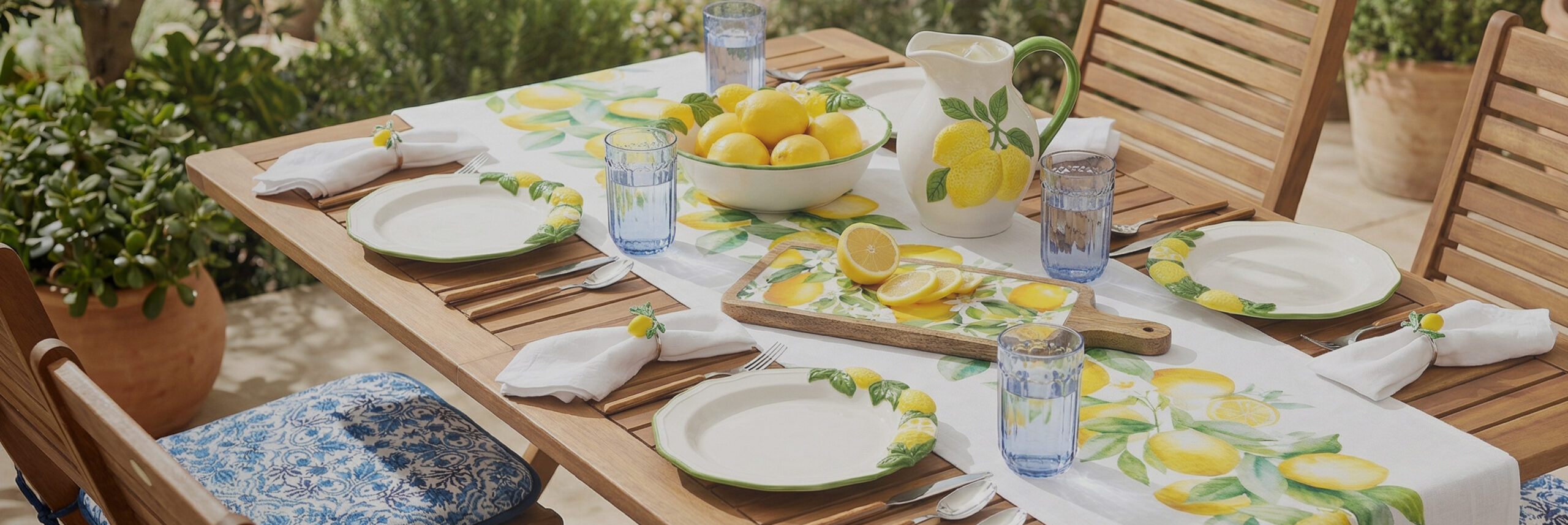 Ανακαλύψτε μια συλλογή εμπνευσμένη από τον ήλιο του Νότου. Μοτίβα με λεμόνια και φρέσκα χρώματα που θα ζωντανέψουν το σπίτι σας, δημιουργώντας το ιδανικό σκηνικό για καλοκαιρινές συγκεντρώσεις. Βρείτε τα στην Pepco σε ελκυστικές τιμές.
