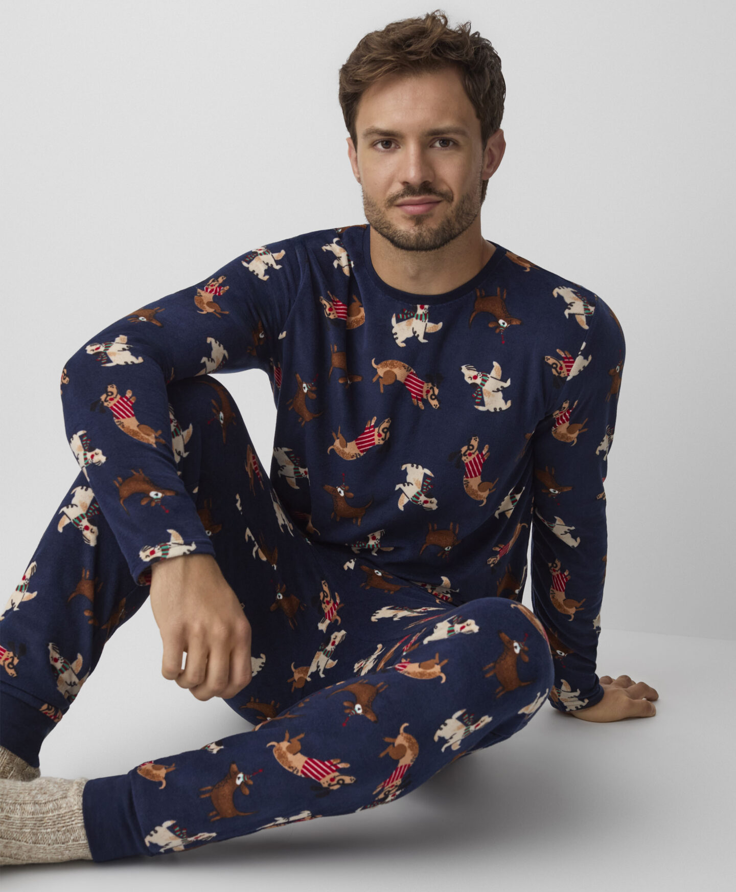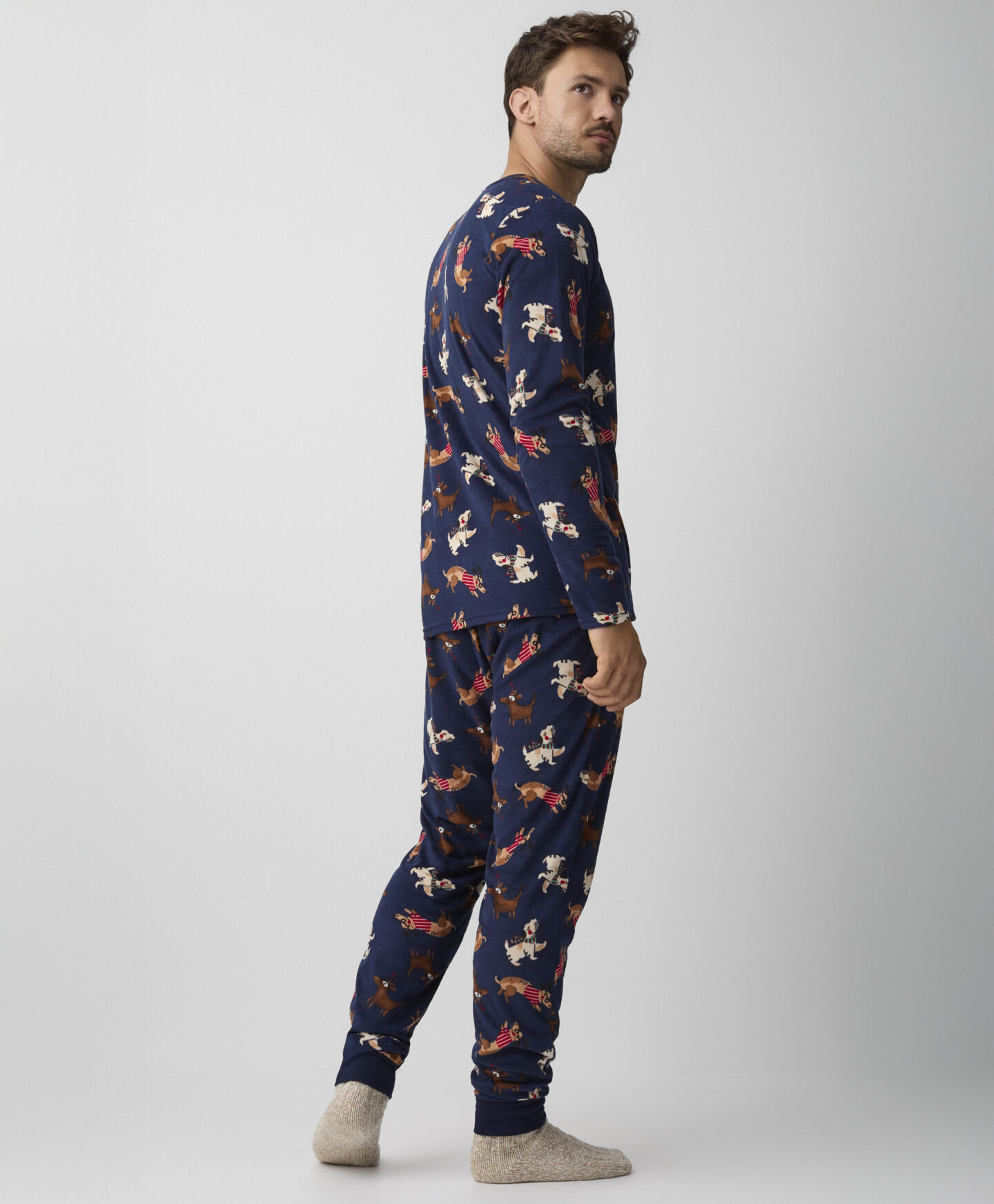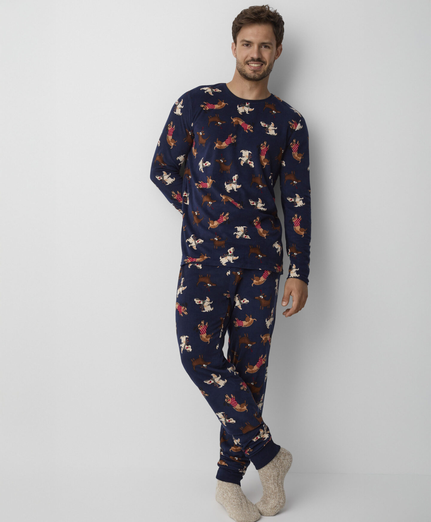 Οι ανδρικές πιτζάμες από βελούδο με σκυλάκια είναι ιδανικές για τις πιο δροσερές μέρες. Κατασκευασμένες από μαλακό και ευχάριστο στην αφή βελούδο, προσφέρουν ζεστασιά, άνεση στον ύπνο και θαλπωρή. Τα παιχνιδιάρικα σχέδια με σκύλους θα κάνουν όλους να θέλουν να τις φορέσουν πριν τον ύπνο. Ιδανικές για τους λάτρεις αυτών των τετράποδων φίλων.