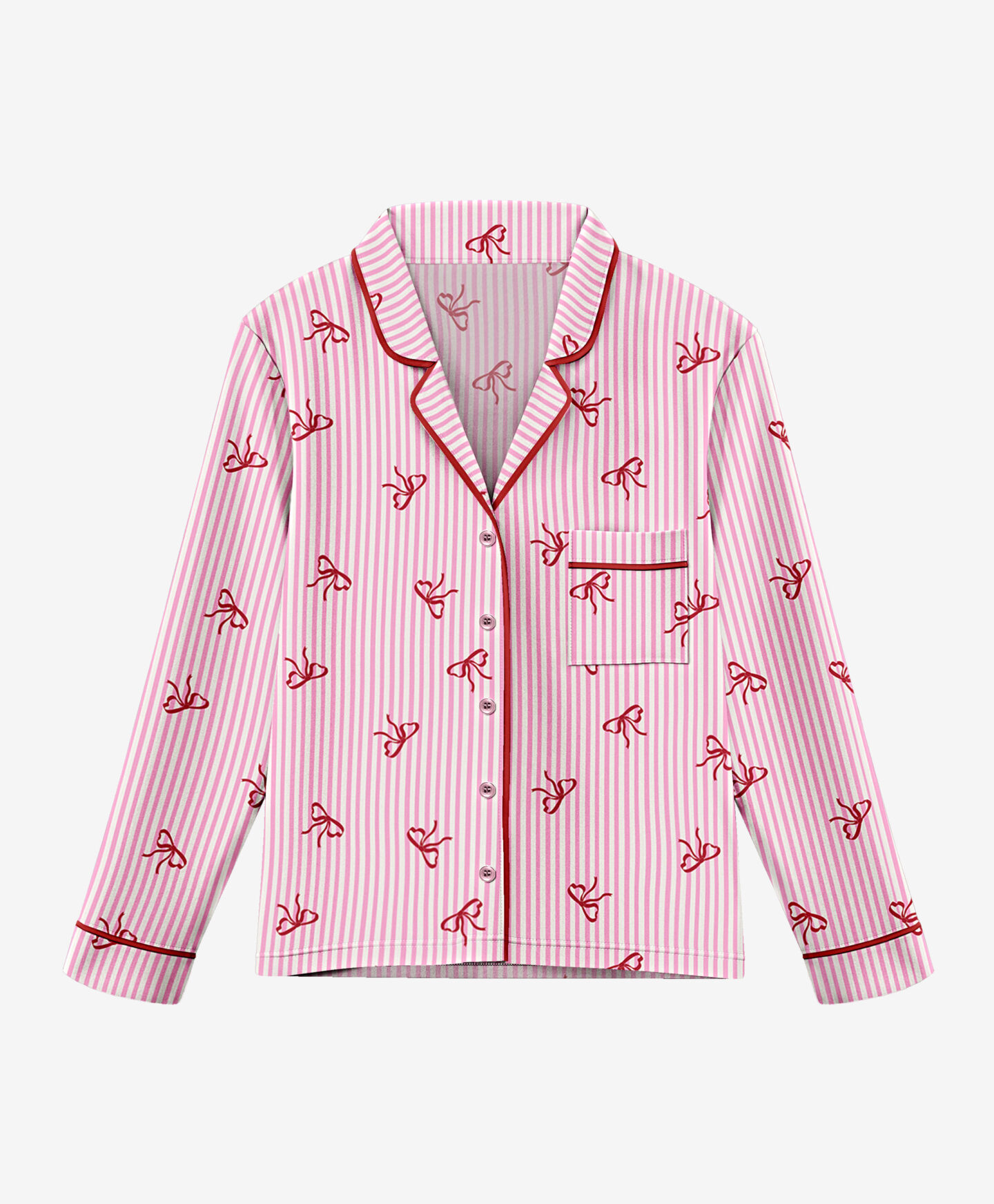 Οι γυναικείες πιτζάμες με σχέδιο φιόγκου αποτελούνται από παντελόνι και μπλούζα με γιακά, που κουμπώνει με χαριτωμένα ροζ κουμπιά. Οι πιτζάμες είναι απαλές στην αφή και ζεστές, ιδανικές για τις πιο δροσερές νύχτες ή για βραδινή χαλάρωση με ένα βιβλίο στο χέρι. Αυτό το σετ πιτζάμας είναι επίσης μια εξαιρετική ιδέα για δώρο.