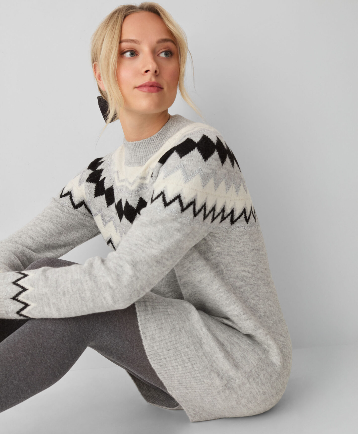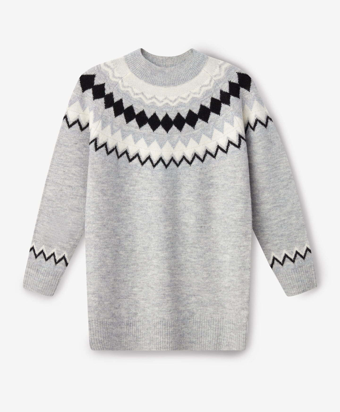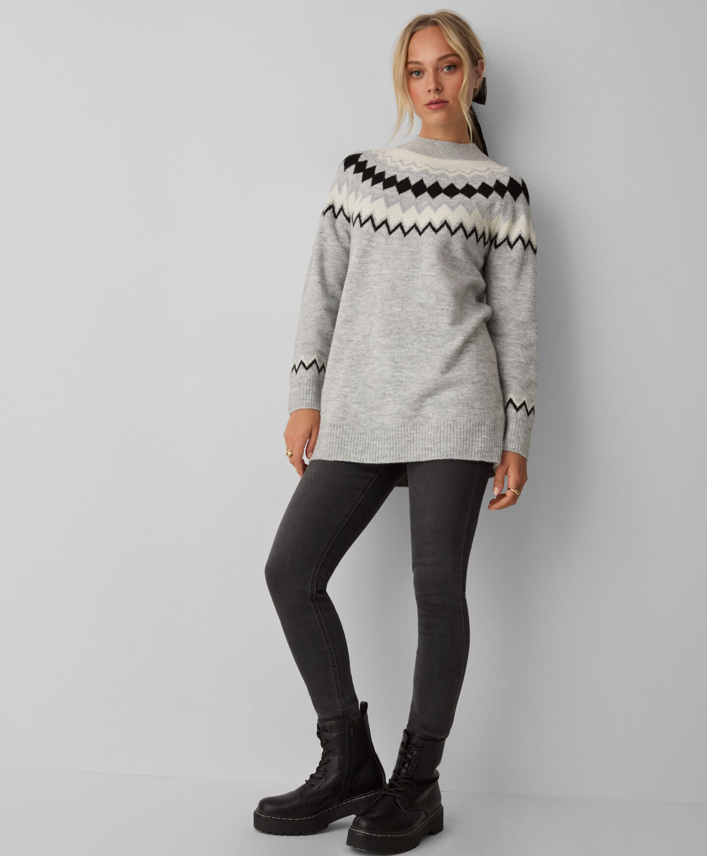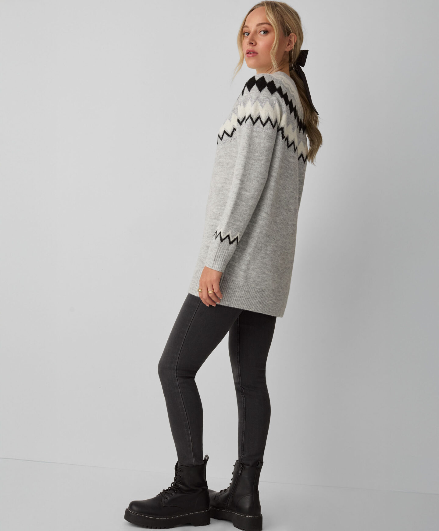 To γκρι πουλόβερ για γυναίκες με σκανδιναβικό σχέδιο θα συμπληρώσει τέλεια την φθινοπωρινή σας γκαρνταρόμπα. Είναι μαλακή, ζεστή και κομψή. Θα ταιριάζει τέλεια με κολάν ή παχύτερα καλσόν. Σε συνδυασμό με μπότες μέχρι το γόνατο ή μποτάκια, δημιουργεί ένα σύνολο ιδανικό για βόλτες, το γραφείο ή συναντήσεις με φίλους στον ελεύθερο χρόνο.