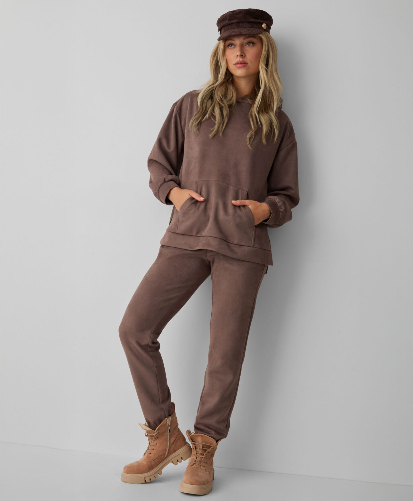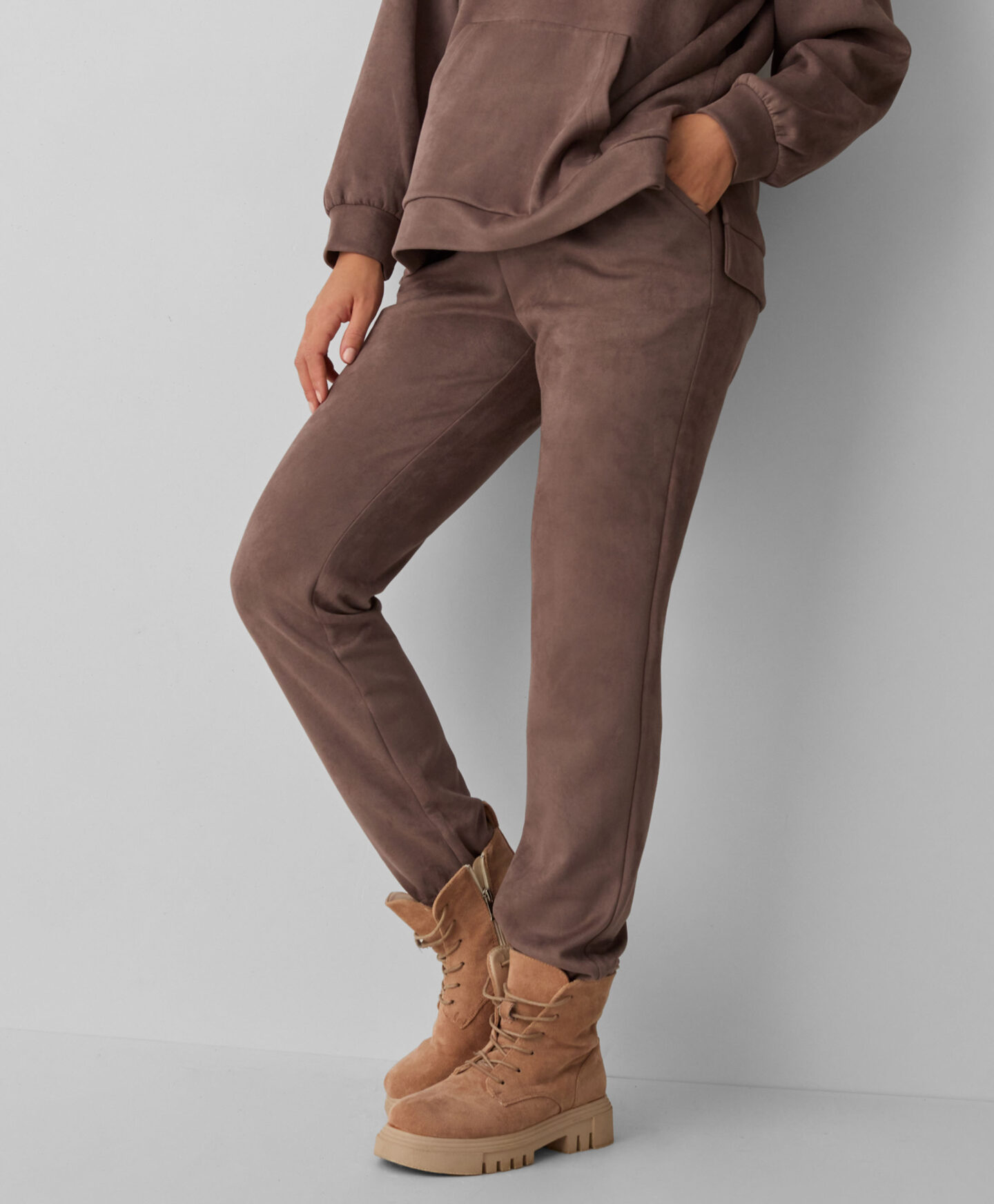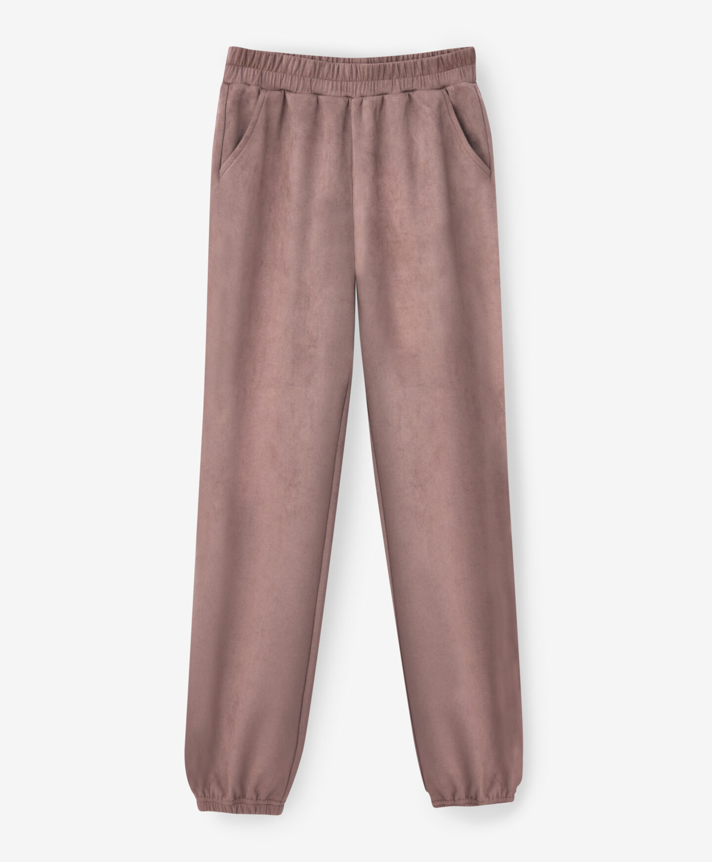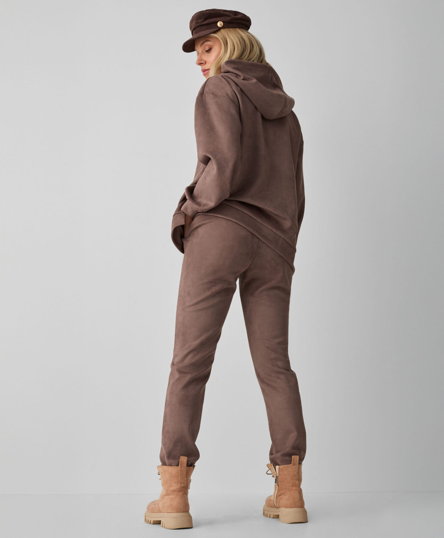 Τα καφέ σουέτ γυναικεία παντελόνια με τσέπες είναι μια κομψή και άνετη επιλογή για κάθε μέρα. Τα παντελόνια είναι μαλακά, ευχάριστα στην αφή και ιδανικά για φθινοπωρινές βόλτες. Η απαλή απόχρωση του καφέ ταιριάζει τέλεια με το φούτερ με κουκούλα από τη συλλογή. Διατίθενται διάφορα σχέδια για να διαλέξετε.
