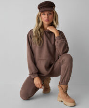 Τα καφέ σουέτ γυναικεία παντελόνια με τσέπες είναι μια κομψή και άνετη επιλογή για κάθε μέρα. Τα παντελόνια είναι μαλακά, ευχάριστα στην αφή και ιδανικά για φθινοπωρινές βόλτες. Η απαλή απόχρωση του καφέ ταιριάζει τέλεια με το φούτερ με κουκούλα από τη συλλογή. Διατίθενται διάφορα σχέδια για να διαλέξετε.