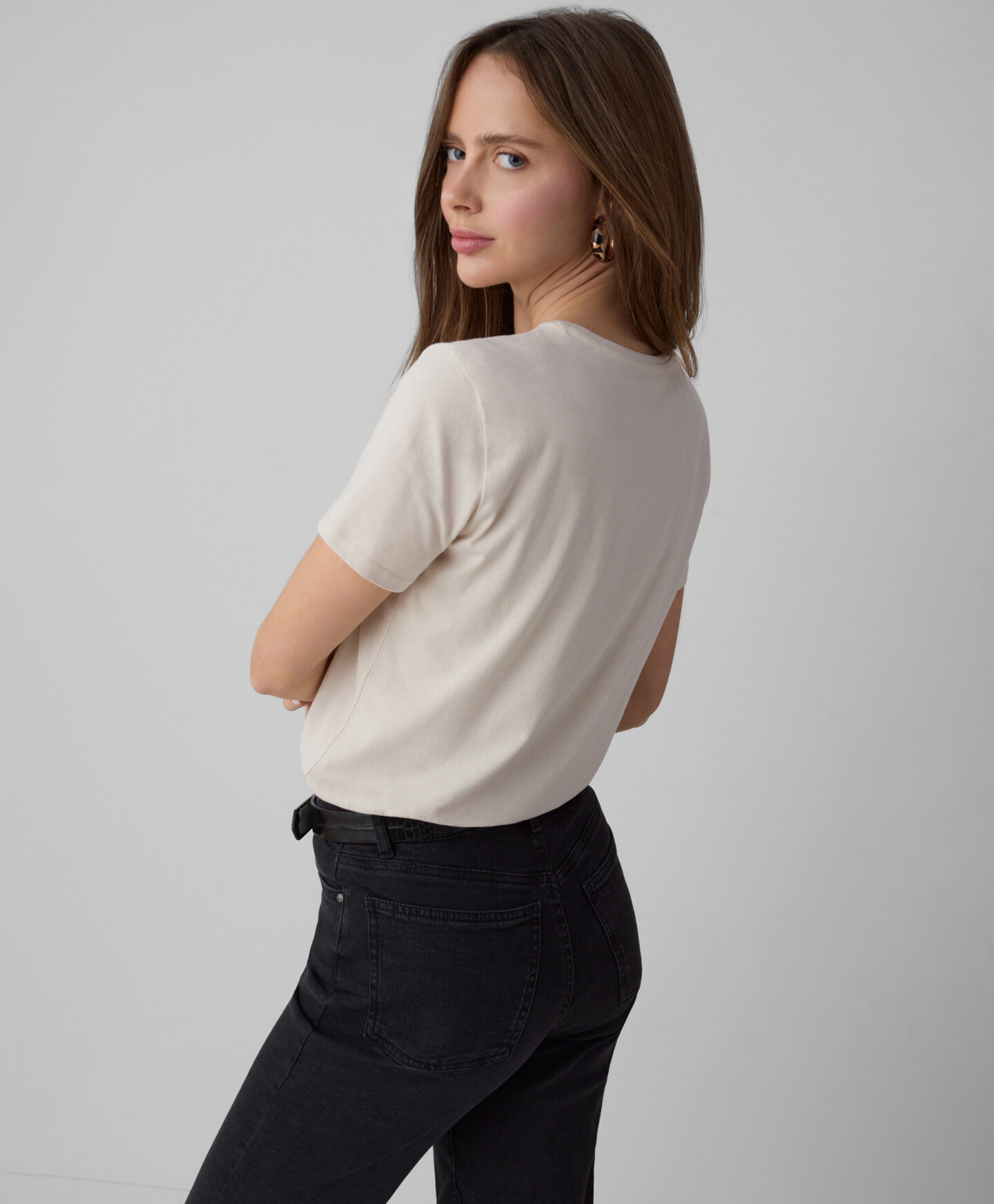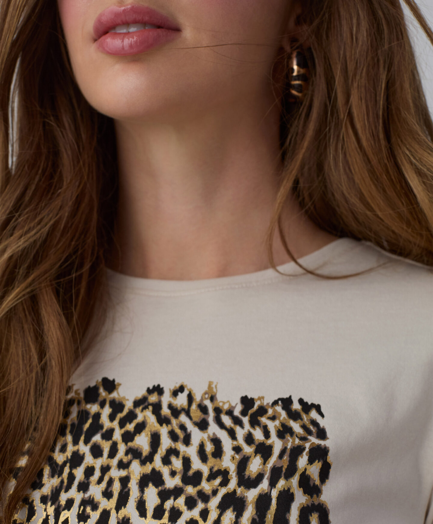 Ένα γυναικείο μπεζ t-shirt από 100% βαμβάκι με τύπωμα προσθέτει λάμψη σε κάθε ντύσιμο. Το φυσικό υλικό είναι απαλό στο δέρμα και προσφέρει απόλυτη άνεση. Το t-shirt ταιριάζει με διάφορους συνδυασμούς. Συνδυασμένο με σπορ παντελόνι ή τζιν, δημιουργεί μια ευέλικτη εμφάνιση, ενώ τα κομψά αξεσουάρ προσδίδουν ένα πιο εκλεπτυσμένο αποτέλεσμα.