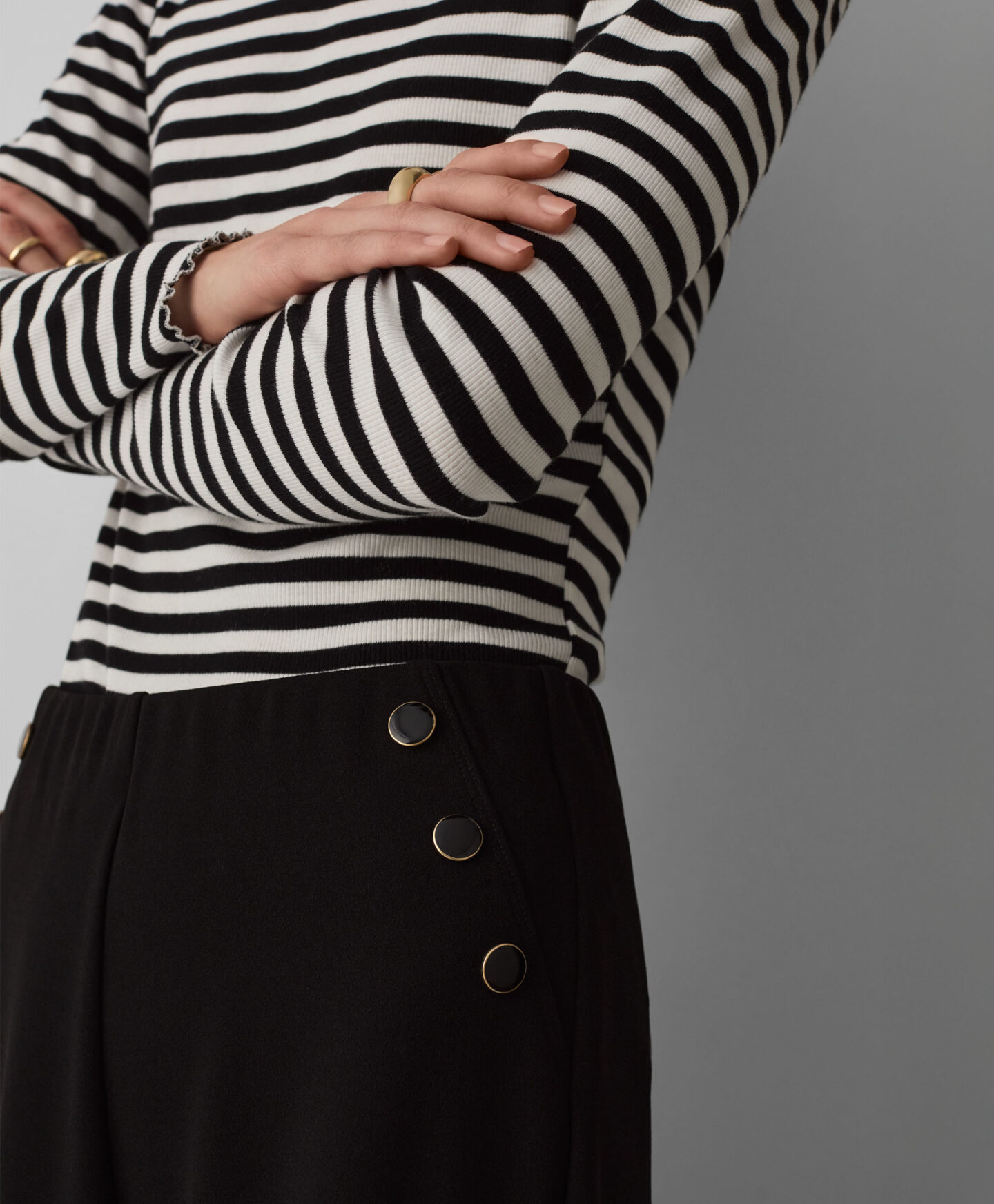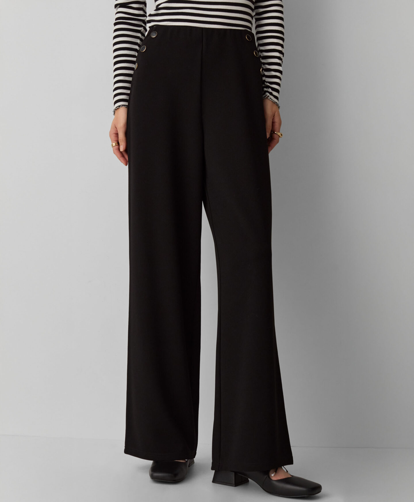 Τα γυναικεία παντελόνια με κουμπιά και φαρδιά πόδια θα σας επιτρέψουν να κάνετε εντύπωση στο γραφείο και σε πιο επίσημες συγκεντρώσεις. Είναι άνετα, ελαφριά και ευχάριστα στη φθορά. Τα διακοσμητικά κουμπιά τραβούν την προσοχή, αποτελώντας ένα μοντέρνο στοιχείο σε κάθε ντύσιμο. Τα φαρδιά πόδια προσφέρουν ελευθερία κινήσεων.