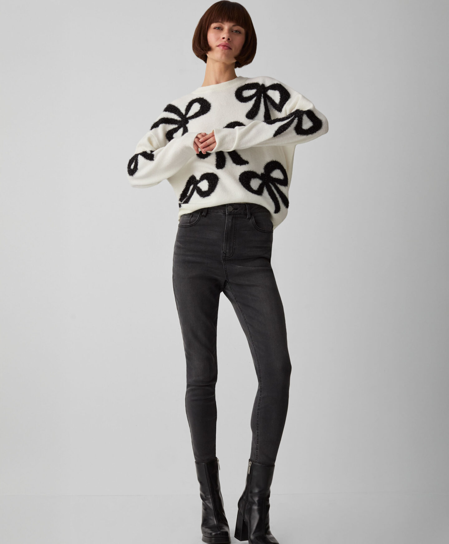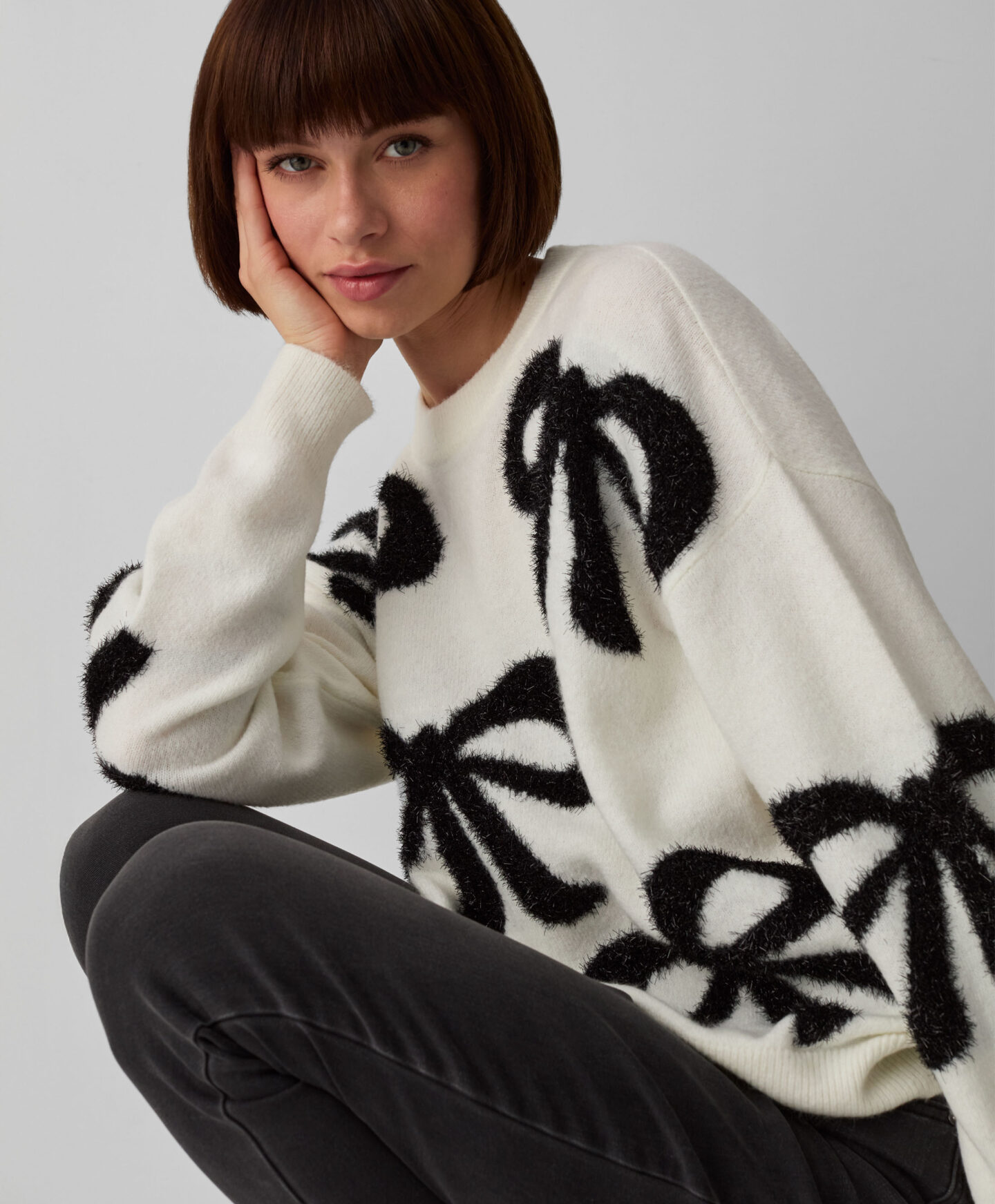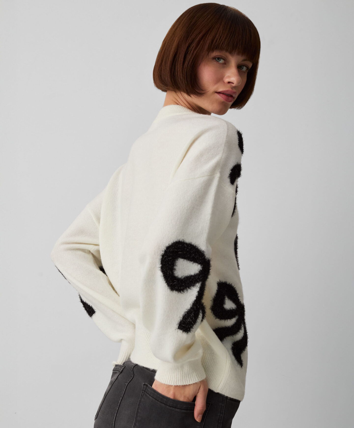 Το γυναικείο πουλόβερ με φιόγκο και lurex είναι για όσες θέλουν να λάμπουν. Ο συνδυασμός κλασικών χρωμάτων όπως το λευκό και το μαύρο θα συμπληρώσει τέλεια τη φθινοπωρινή σας γκαρνταρόμπα, προσφέροντας πολλές επιλογές στυλ. Το πουλόβερ είναι ζεστό, απαλό στην αφή και φαίνεται όμορφο στη σιλουέτα.