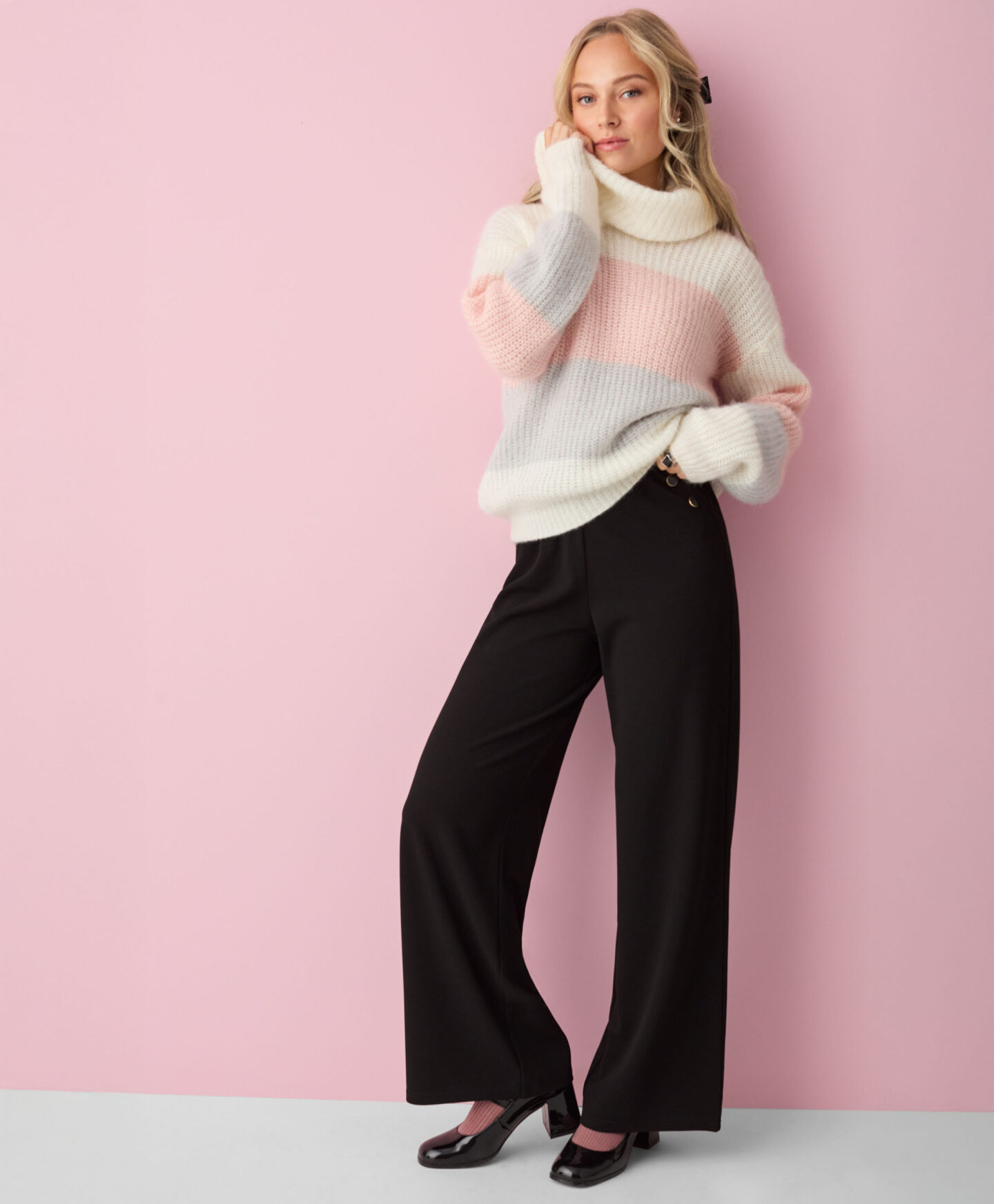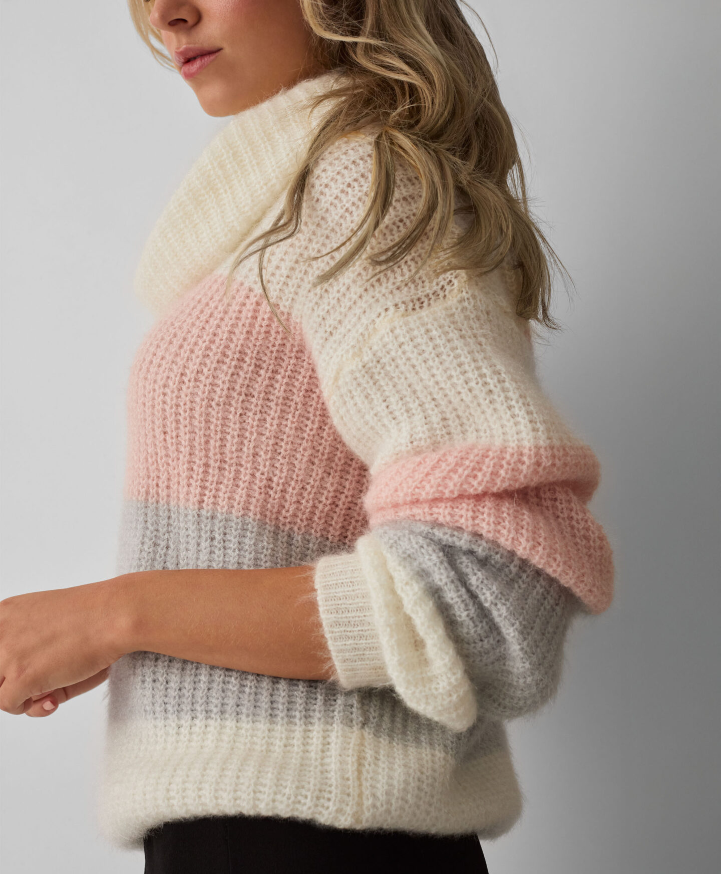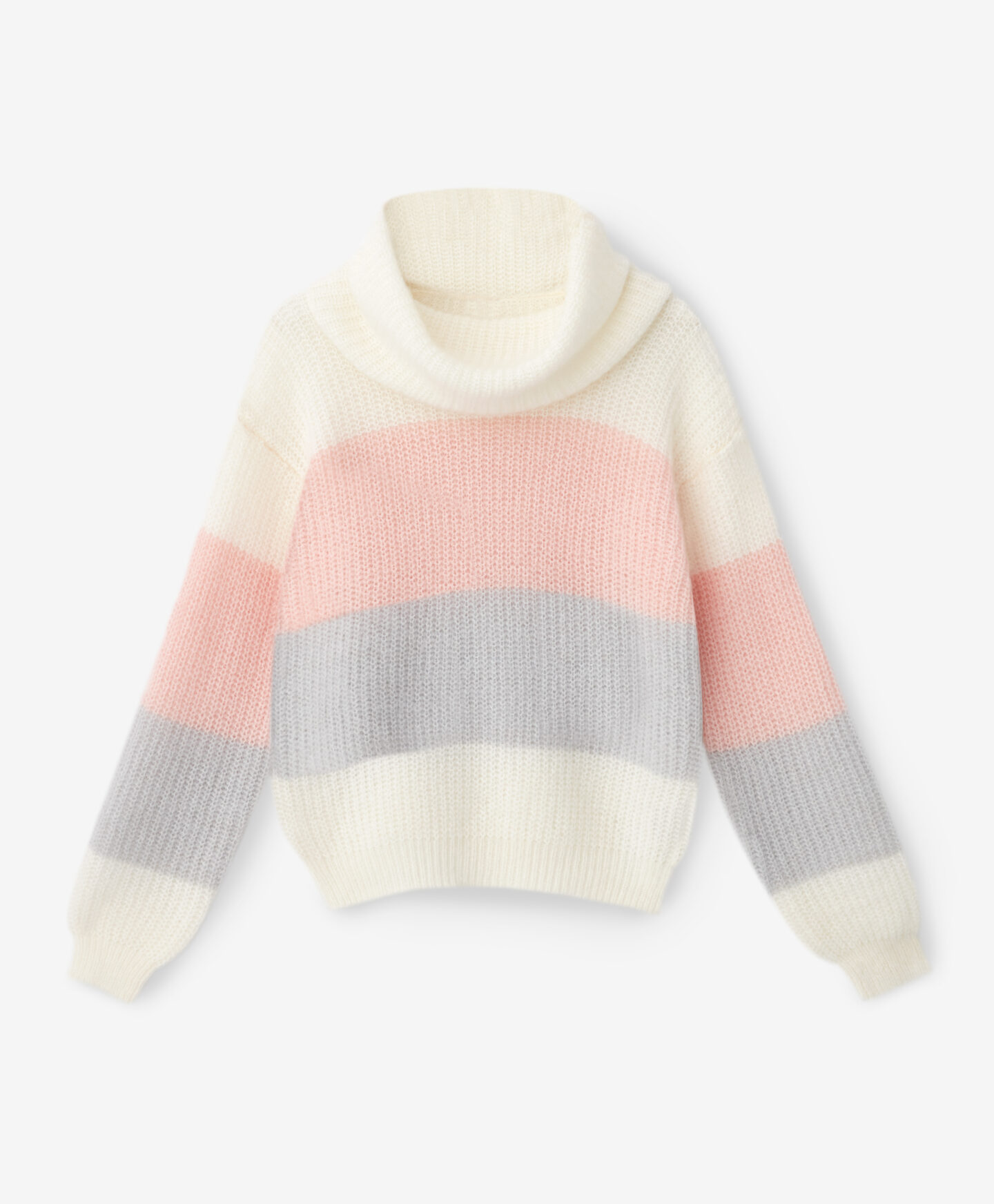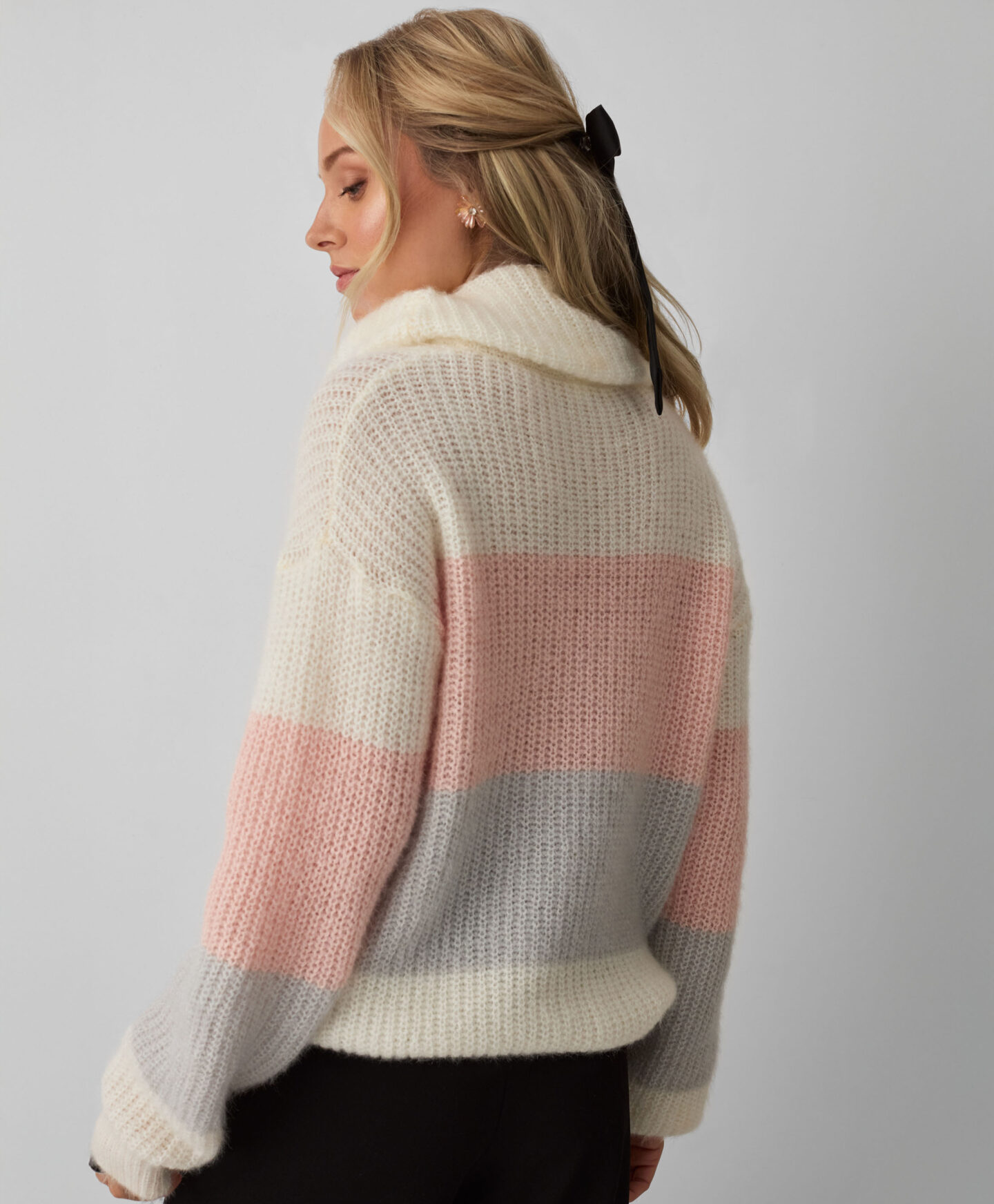 Το ριγέ γυναικείο πουλόβερ με ζιβάγκο θα σας κρατήσει ζεστή τις κρύες μέρες. Είναι ζεστό, απαλό στην αφή και άνετο στη φθορά. Οι φαρδιές ρίγες σε παστέλ χρώματα προσθέτουν λεπτότητα. Θα φαίνεται υπέροχο όταν συνδυαστεί με κλασικά τζιν, τόσο με κομψά παντελόνια όσο και με πιο σπορ.
