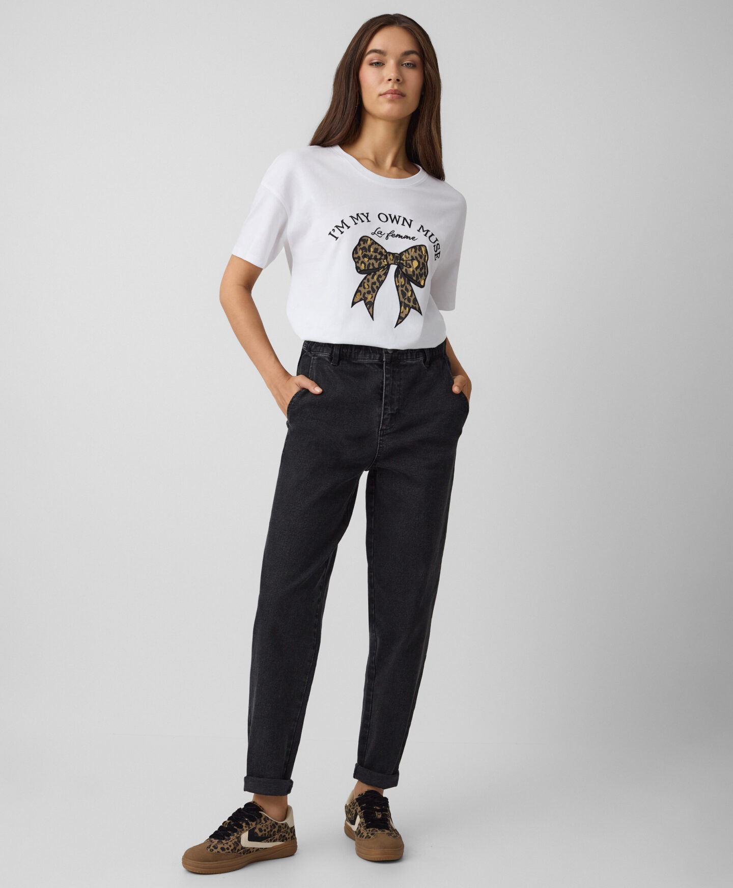 Το γυναικείο τζιν παντελόνι είναι η ιδανική επιλογή για το γραφείο και τον ελεύθερο χρόνο. Πλούσιο σε βαμβάκι, είναι άνετο και ταιριάζει υπέροχα με ένα κλασικό λευκό t-shirt ή ένα κοντό πουλόβερ.