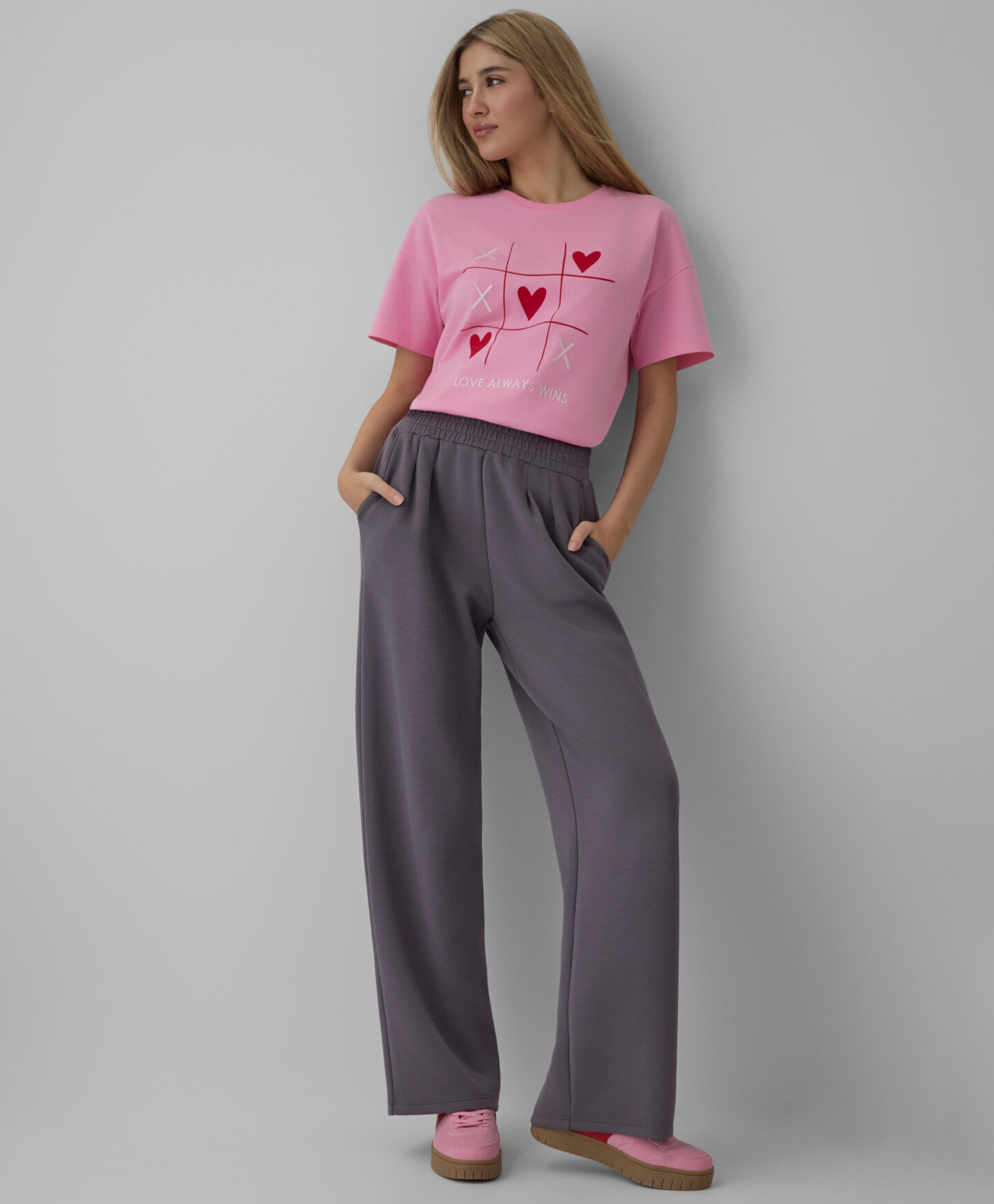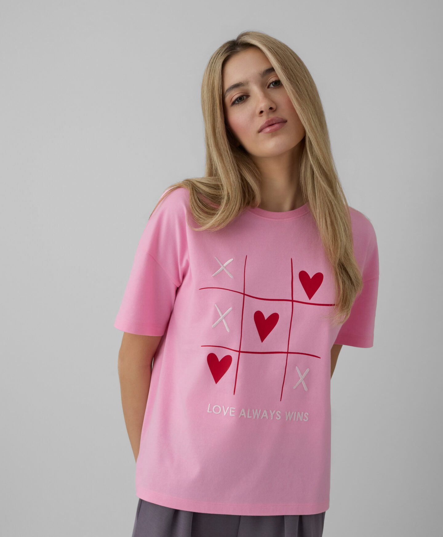 Το γυναικείο μπλουζάκι με καρδιές, κατασκευασμένο από 100% βαμβάκι με κοντά μανίκια, είναι μια εξαιρετική επιλογή για καθημερινή χρήση. Το μπλουζάκι είναι πολύ ευέλικτο. Το απαλό και αναπνεύσιμο ύφασμα προσφέρει άνεση, ενώ το γοητευτικό σχέδιο καρδιών προσθέτει μια ρομαντική πινελιά σε κάθε ντύσιμο.