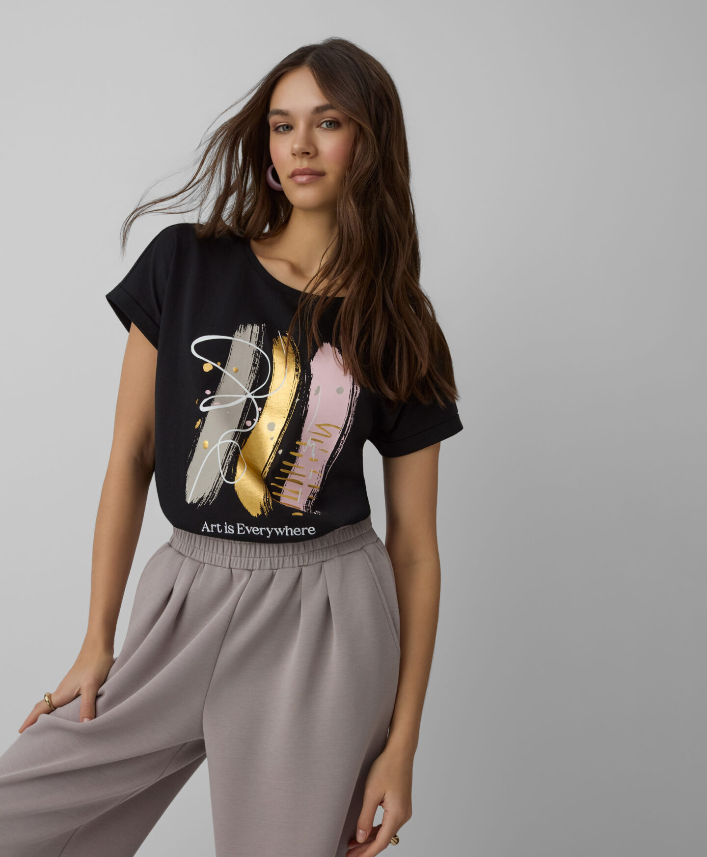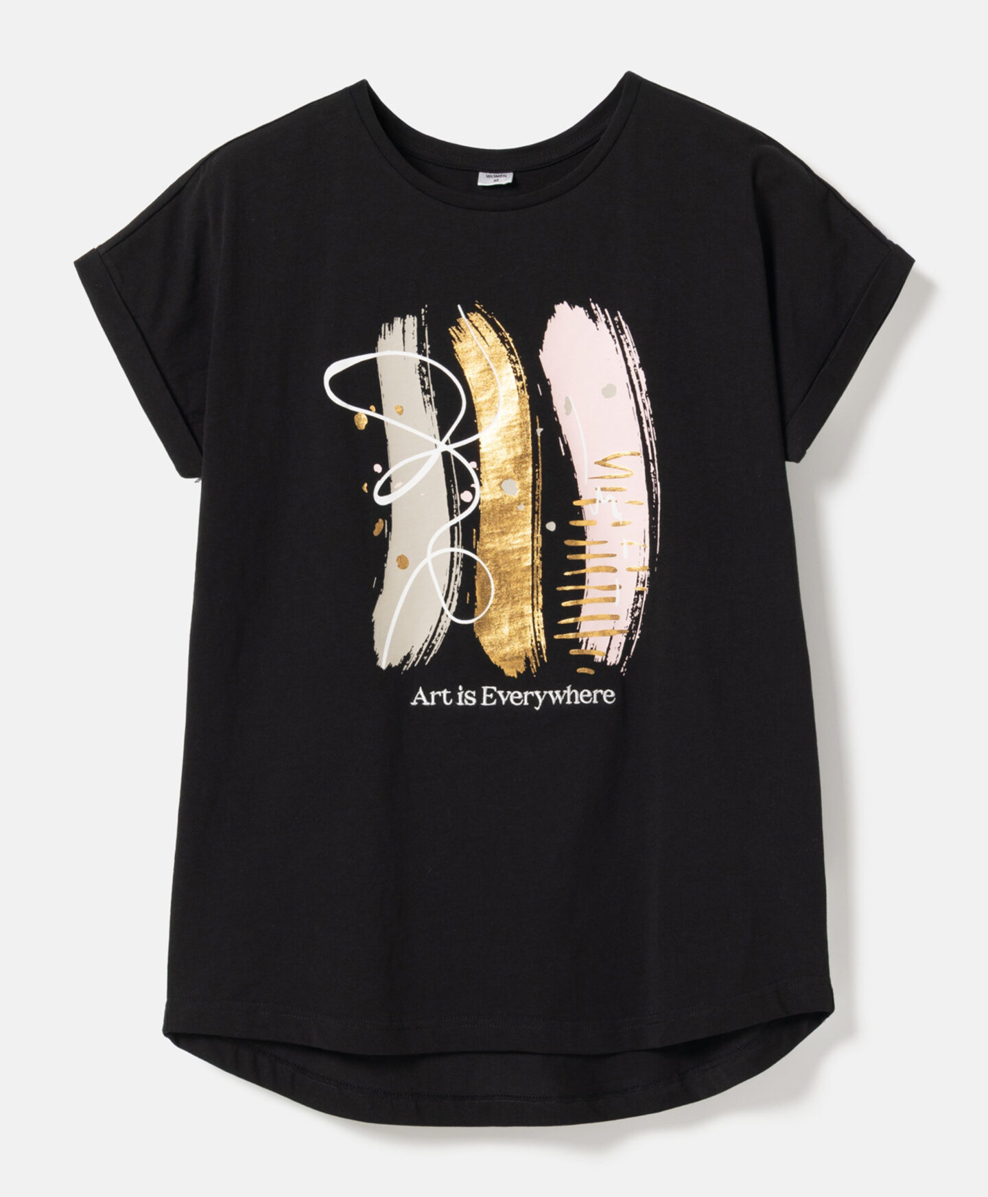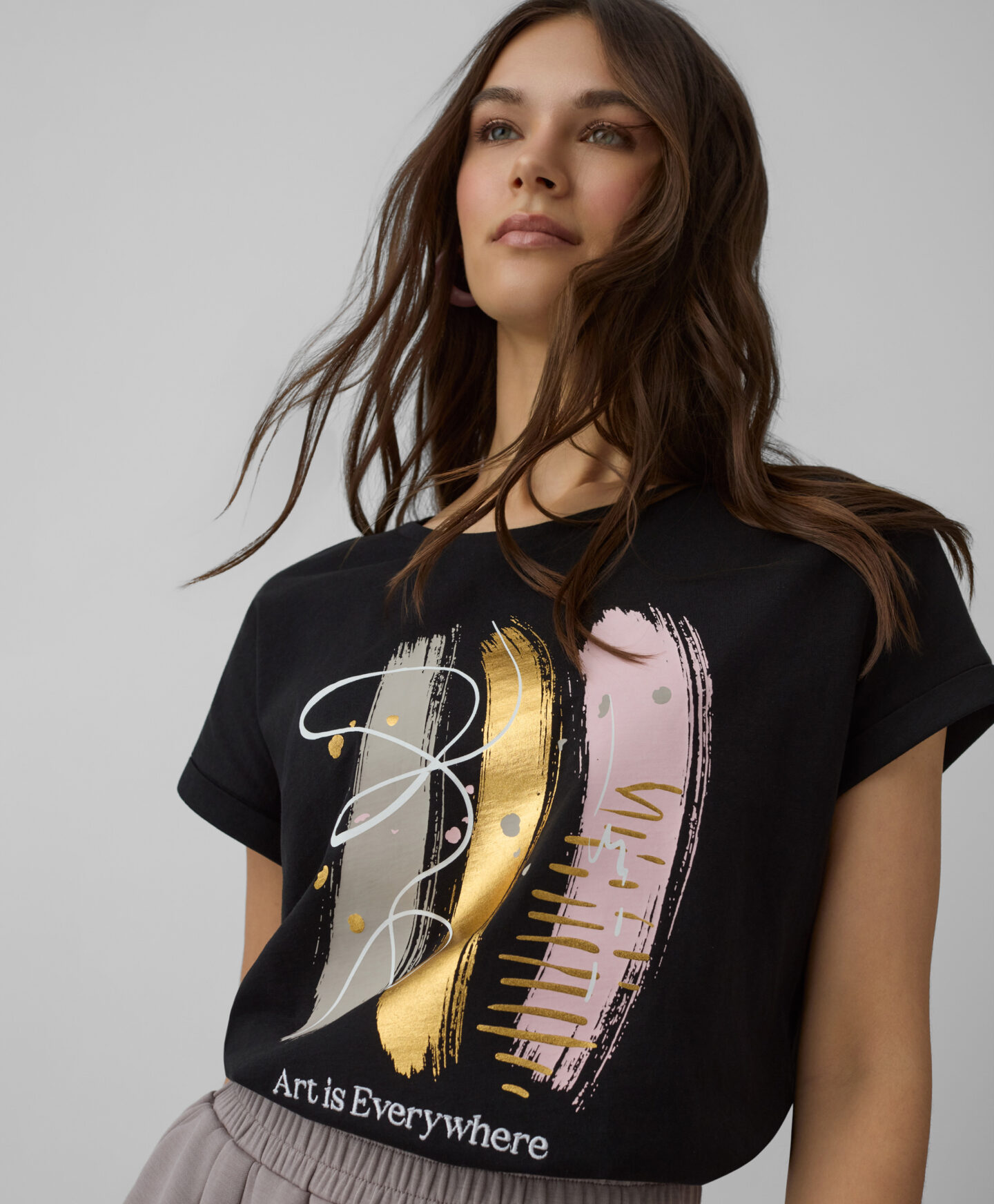 Ένα γυναικείο t-shirt από 100% βαμβάκι με κοντά μανίκια είναι ιδανικό για τους λάτρεις των άνετων συνόλων. Η κοπή του επιτρέπει την ελευθερία κινήσεων, προσδίδοντας ταυτόχρονα μια χαλαρή πινελιά σε κάθε σύνολο. Το τολμηρό γραφικό σχέδιο στο μπροστινό μέρος τραβάει το βλέμμα.