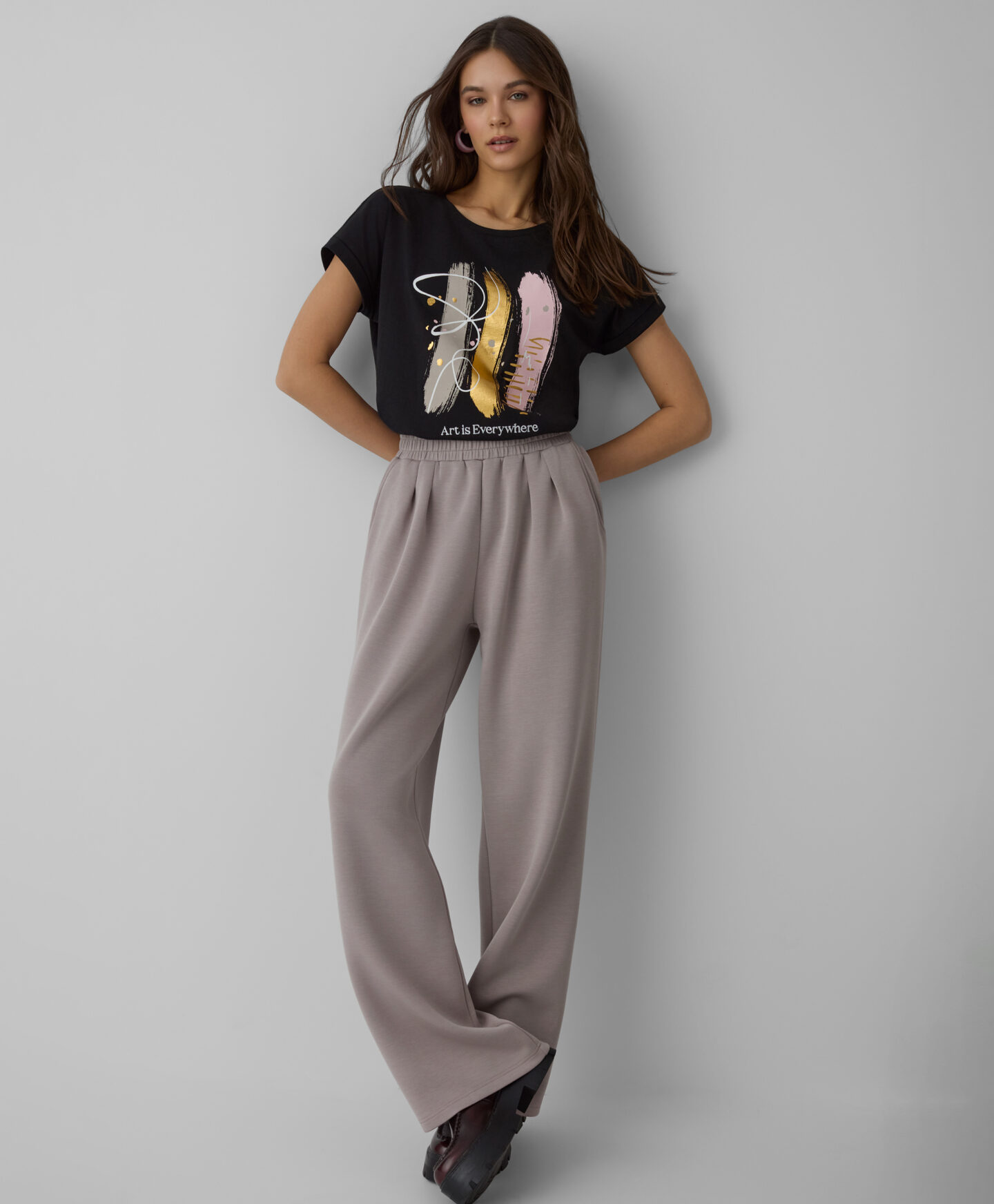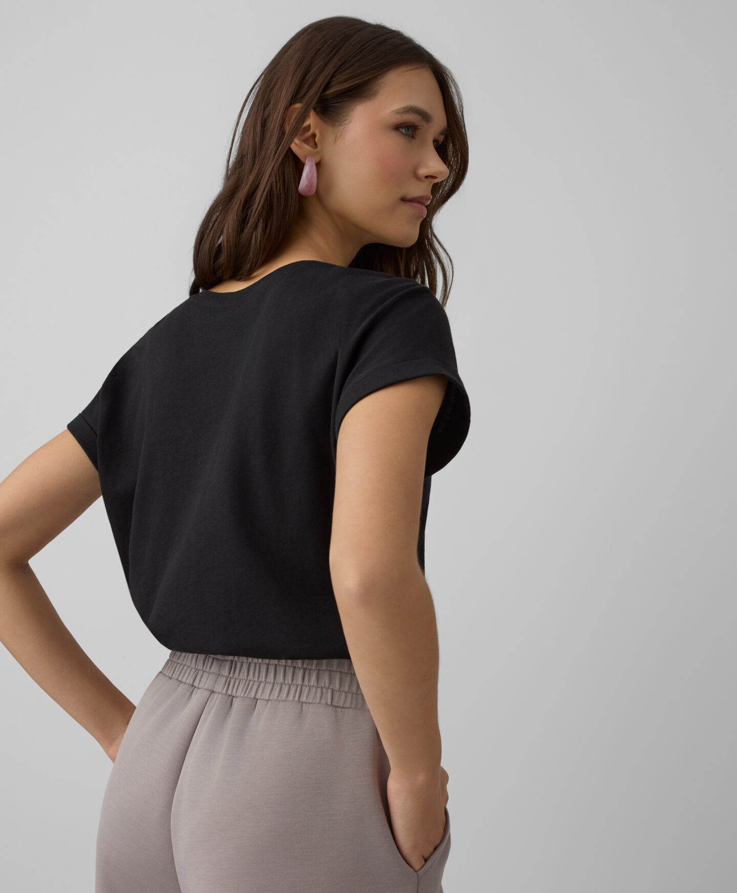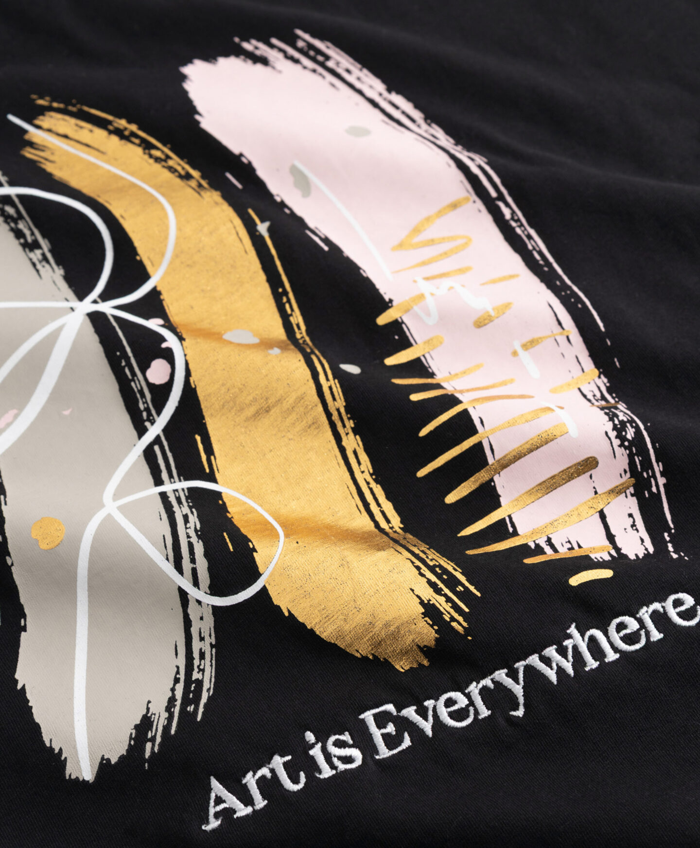 Ένα γυναικείο t-shirt από 100% βαμβάκι με κοντά μανίκια είναι ιδανικό για τους λάτρεις των άνετων συνόλων. Η κοπή του επιτρέπει την ελευθερία κινήσεων, προσδίδοντας ταυτόχρονα μια χαλαρή πινελιά σε κάθε σύνολο. Το τολμηρό γραφικό σχέδιο στο μπροστινό μέρος τραβάει το βλέμμα.