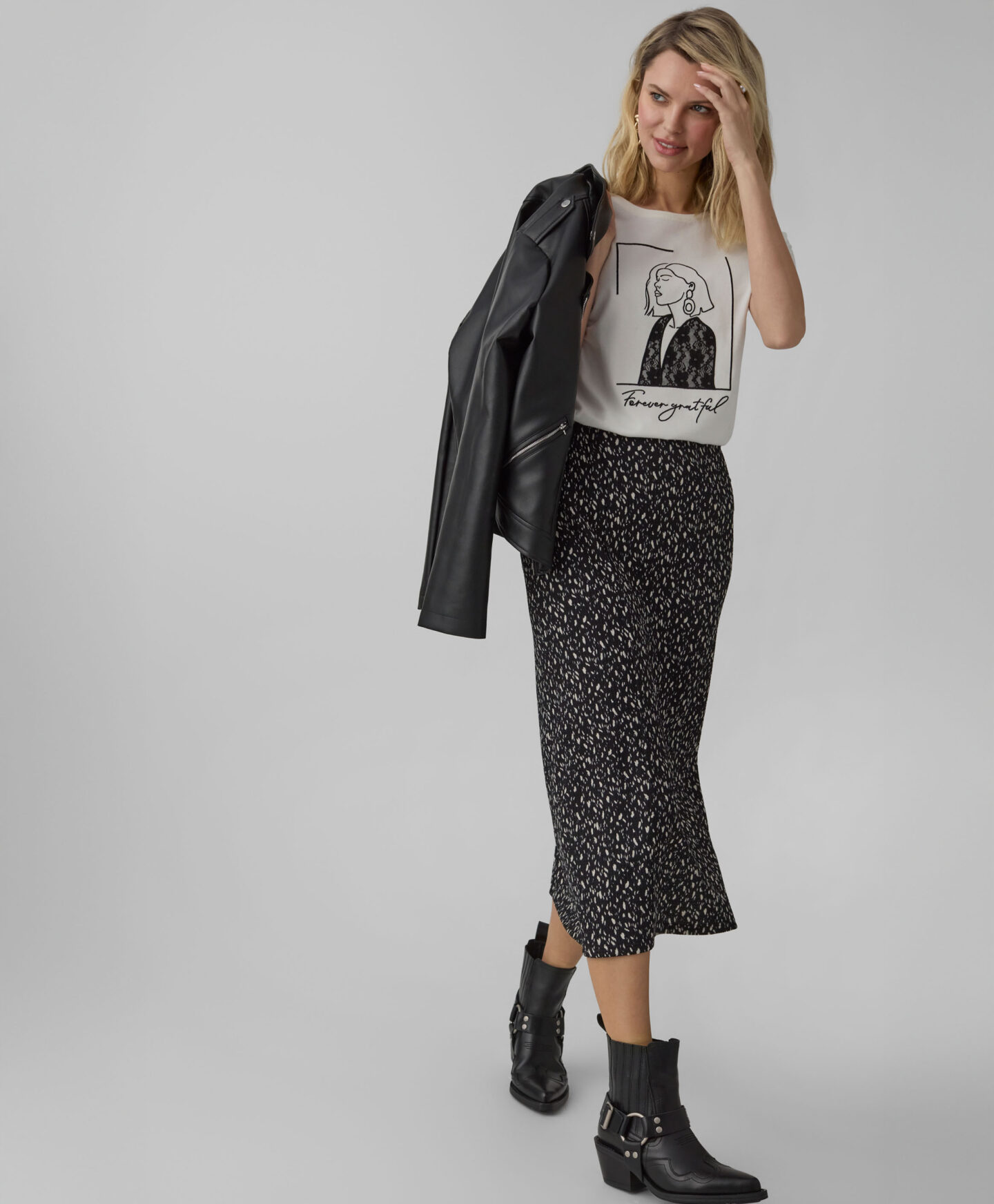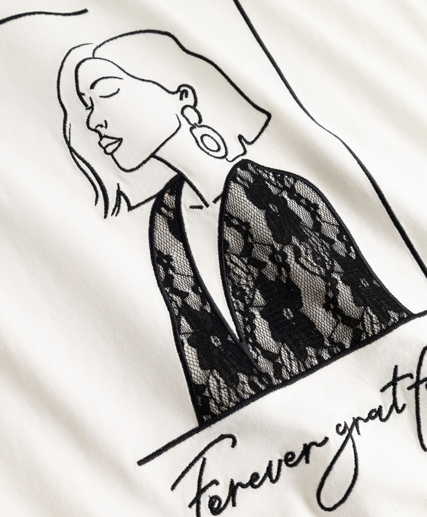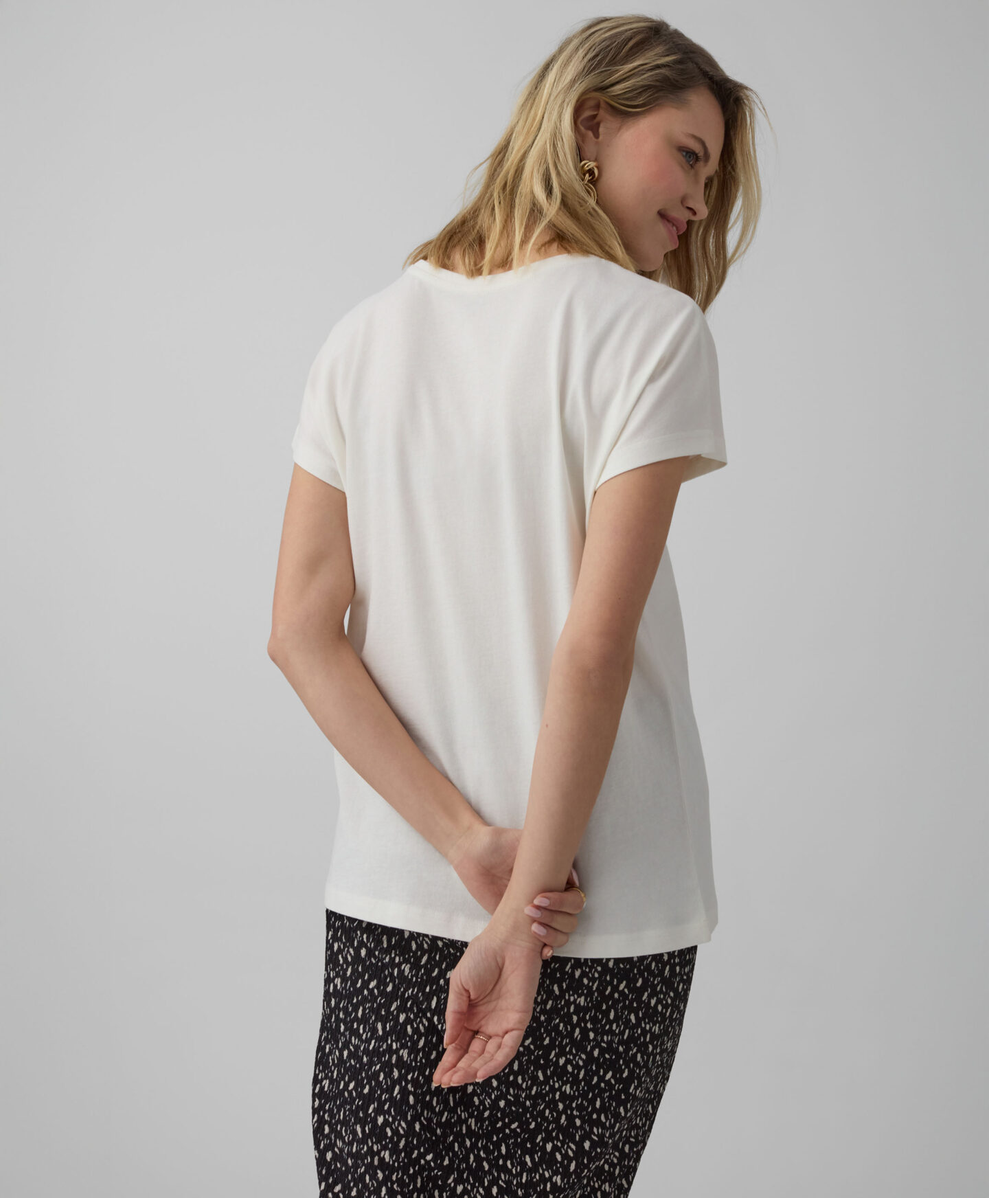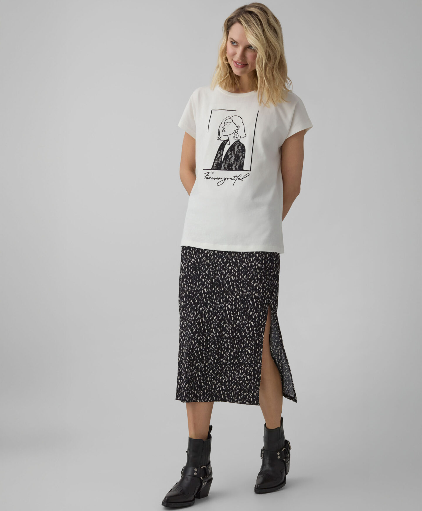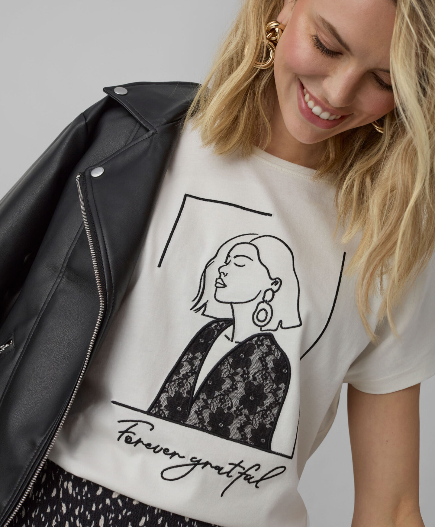 Ένα γυναικείο t-shirt από 100% βαμβάκι ξεχωρίζει με το γραφικό στο μπροστινό μέρος. Φαινομενικά κλασικό, τραβάει την προσοχή με μοντέρνες λεπτομέρειες, λάμποντας σε κάθε ντύσιμο. Το t-shirt ταιριάζει τόσο με τζιν όσο και με φούστα. Μπορείτε επίσης να το συνδυάσετε με κομψά παντελόνια και σακάκι για ειδικές περιστάσεις. Είναι απαλό, ευχάριστο στην αφή και επιτρέπει στο δέρμα σας να αναπνέει.