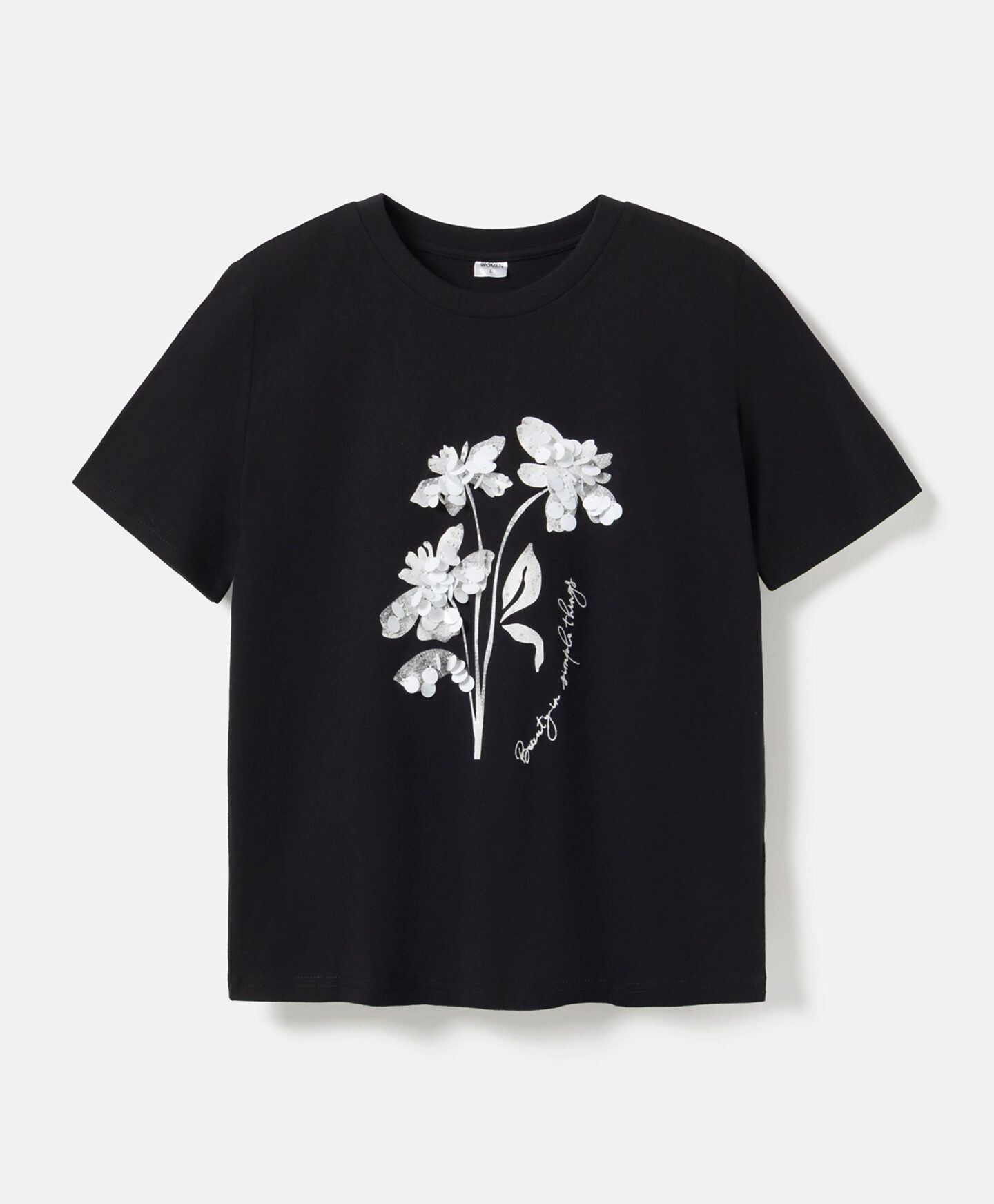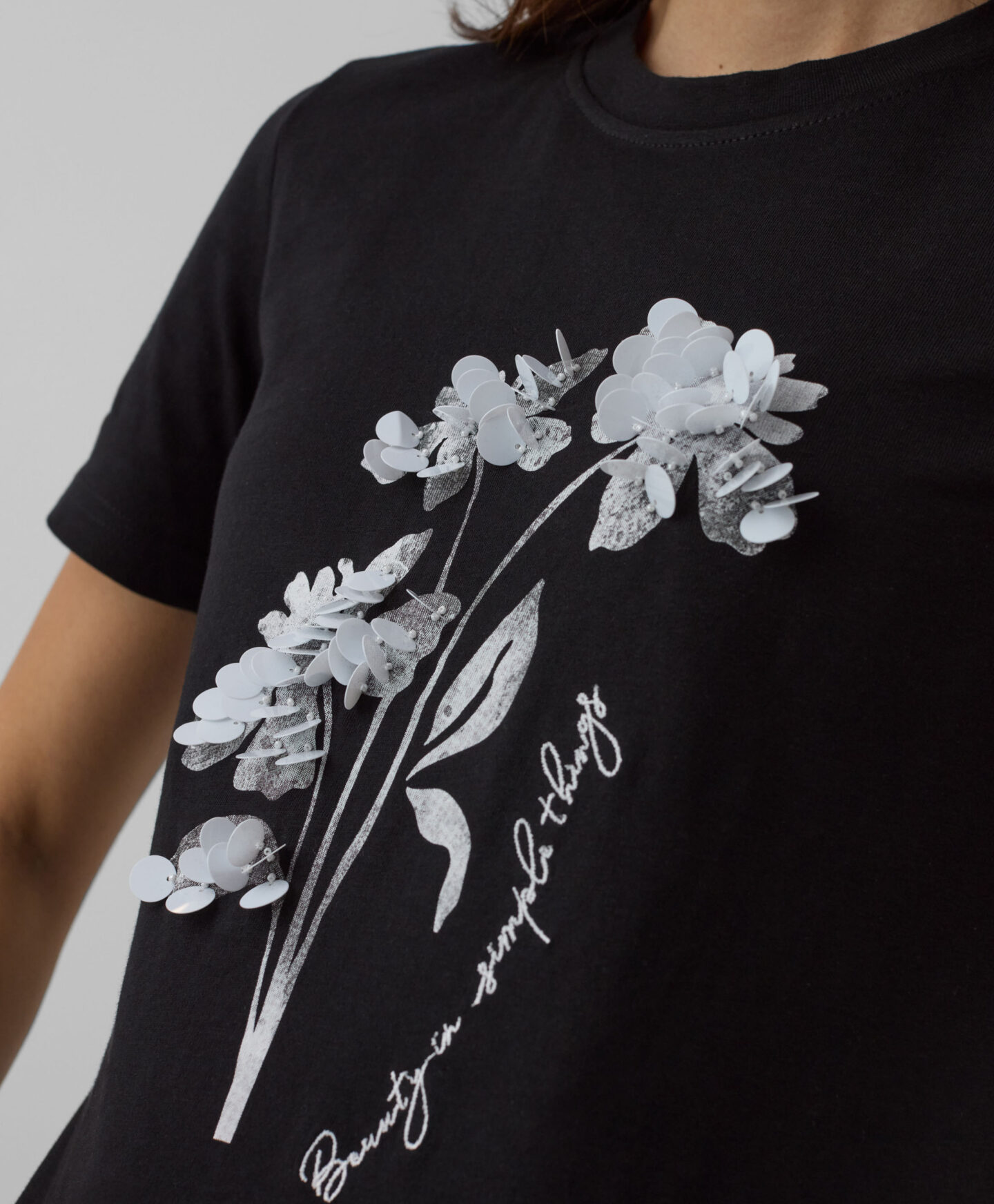 Ένα γυναικείο t-shirt από 100% βαμβάκι με εφαρμογή από πούλιες λάμπει σε κάθε ντύσιμο! Η κλασική γραμμή, το λαμπερό σχέδιο στο μπροστινό μέρος και το ουδέτερο χρώμα προσφέρουν έναν κομψό συνδυασμό ιδανικό για πολλές περιστάσεις. Το t-shirt θα ξεχωρίσει κάτω από ένα σακάκι και θα συμπληρώσει με επιτυχία ένα ντουέτο με μια κομψή φούστα. Το μαλακό υλικό εξασφαλίζει άνετη εφαρμογή.