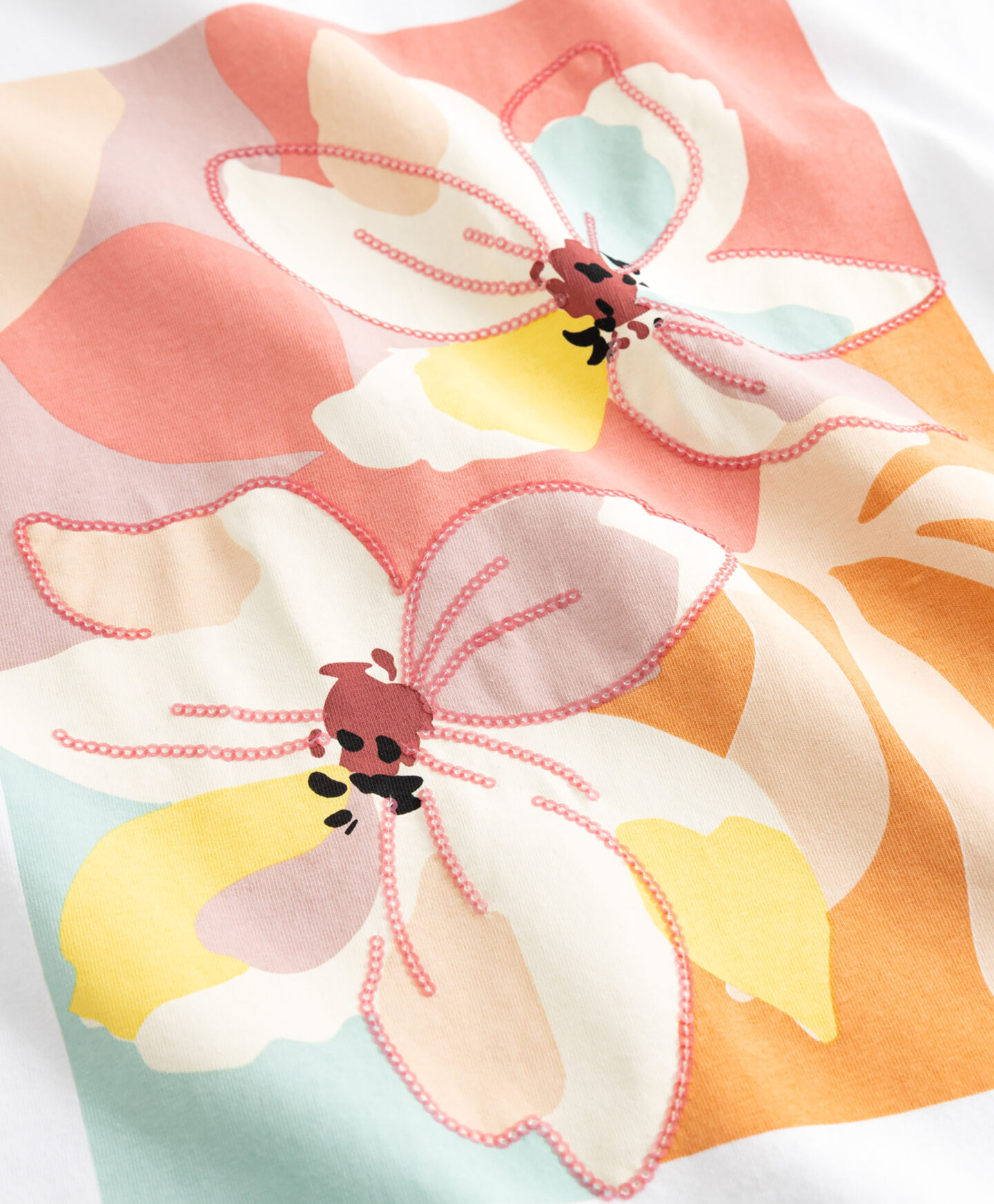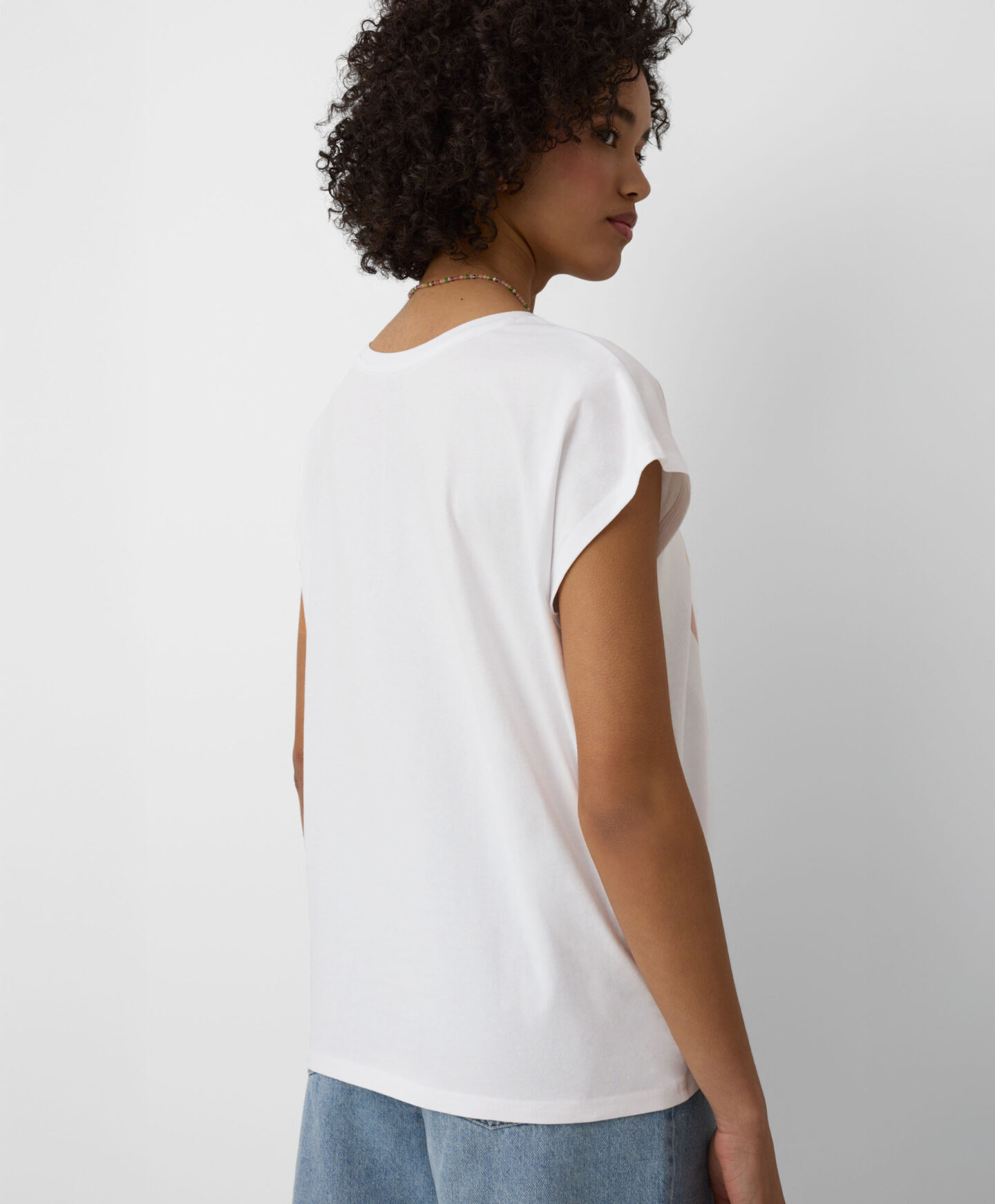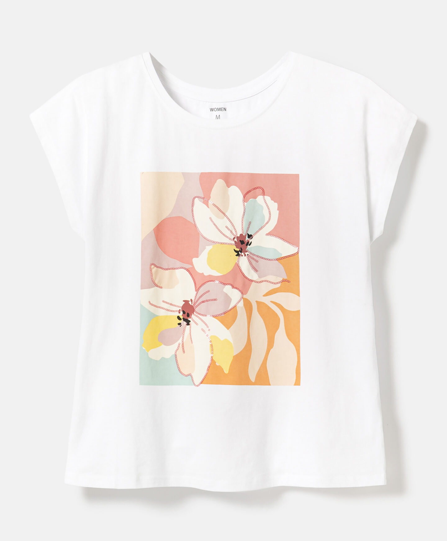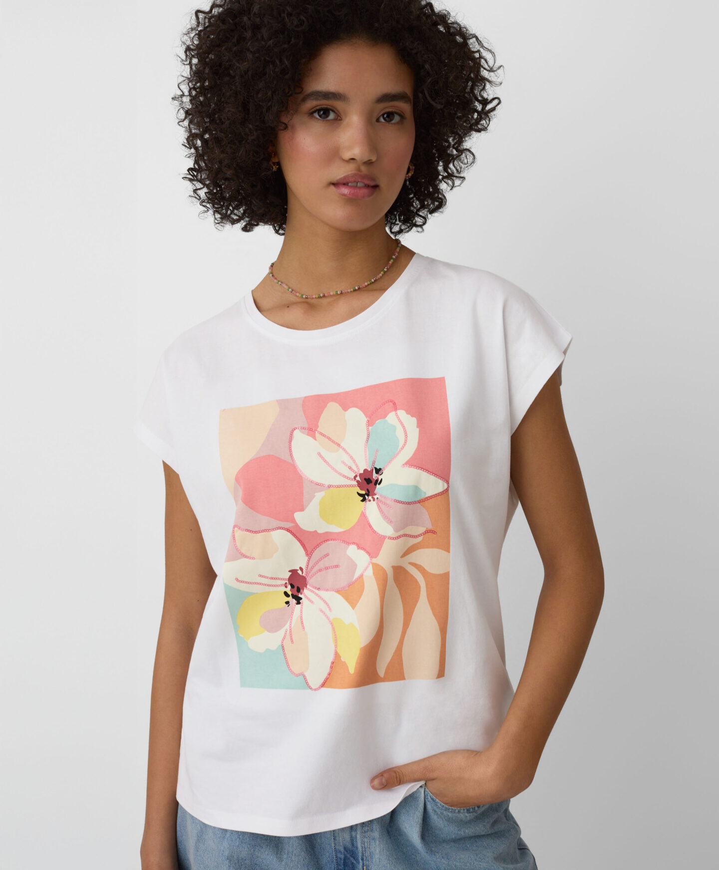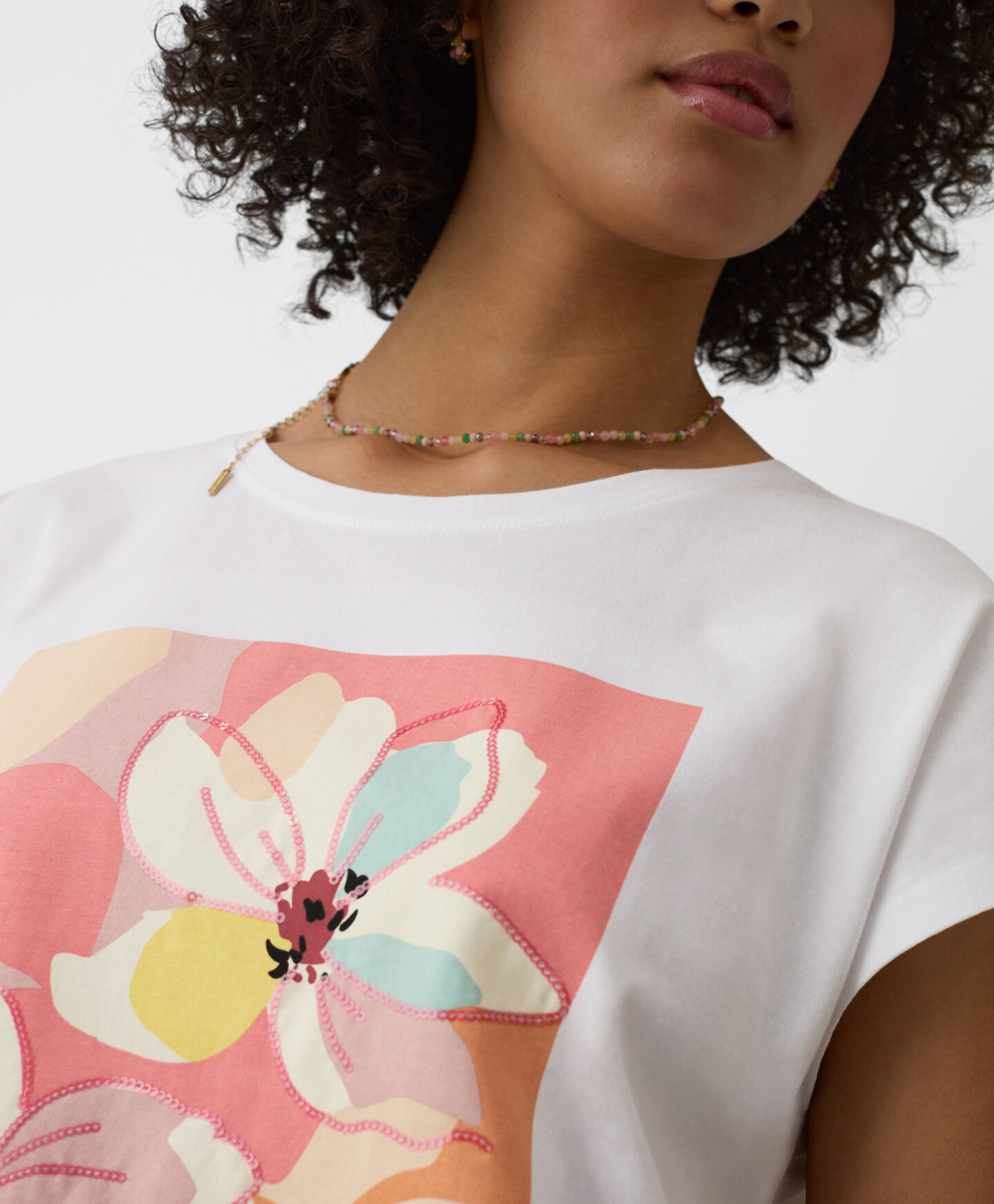 Αυτό το γυναικείο t-shirt, κατασκευασμένο με υψηλή περιεκτικότητα σε βαμβάκι και μια πινελιά ελαστάνης, εφαρμόζει υπέροχα. Το σχέδιο στο μπροστινό μέρος, με ένα λουλούδι διακοσμημένο με πούλιες, θα γοητεύσει κάθε λάτρη των λουλουδιών. Το t-shirt είναι άνετο, αέρινο και αφήνει το δέρμα να αναπνέει. Ιδανικό για να το συνδυάσετε με το αγαπημένο σας τζιν, φόρμα ή κομψό παντελόνι τσιγάρο.