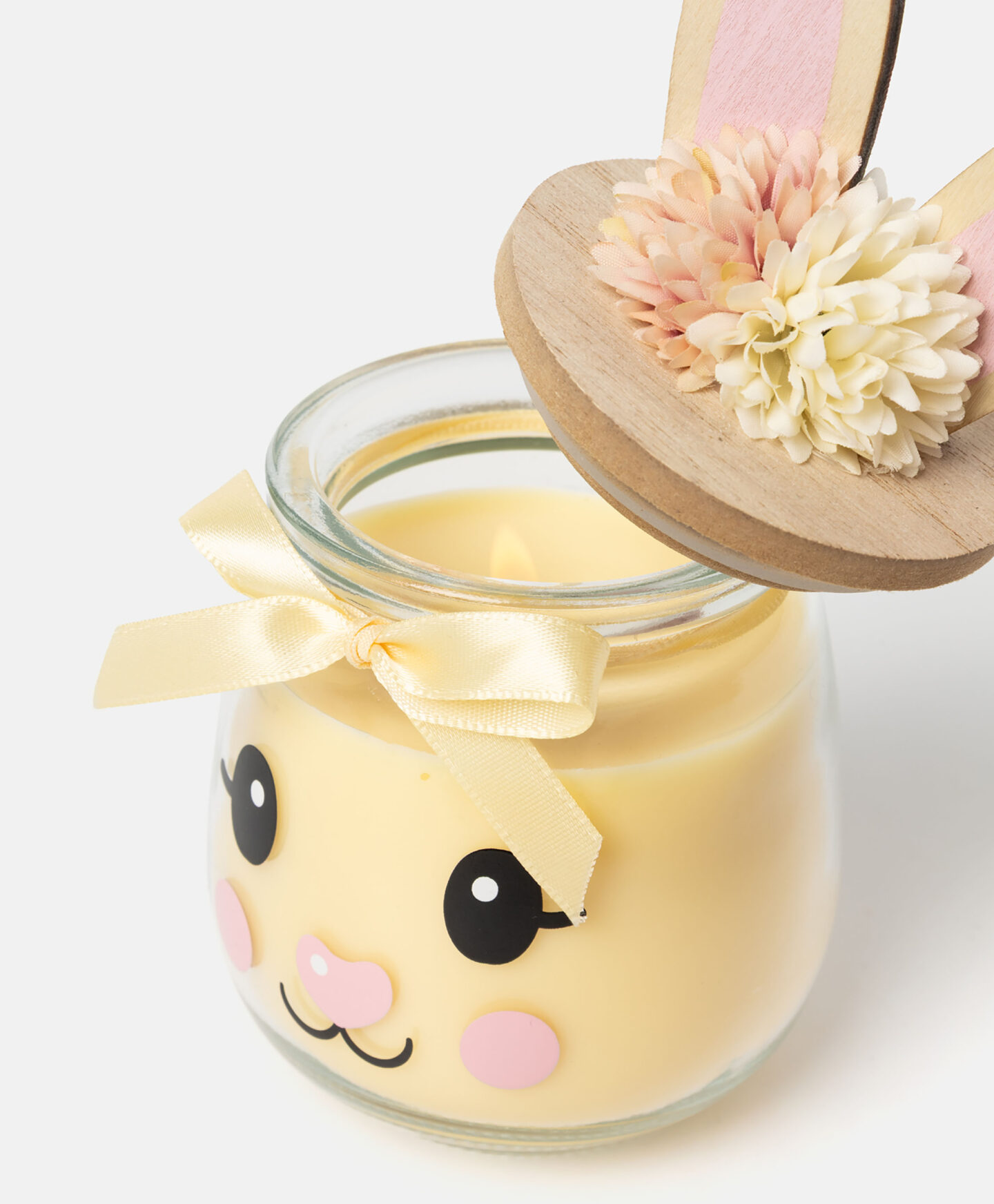 Το κίτρινο αρωματικό κερί σε γυάλινο δοχείο διαθέτει διακοσμητικό καπάκι με τρισδιάστατα αυτιά. Ο σχεδιασμός του, εμπνευσμένος από λαγουδάκια, του δίνει μια πολύ γοητευτική εμφάνιση που σίγουρα θα αρέσει στα μικρότερα μέλη της οικογένειας. Προσφέρει μεγάλη διάρκεια καύσης και όμορφο άρωμα. Διατίθενται τρία σχέδια.