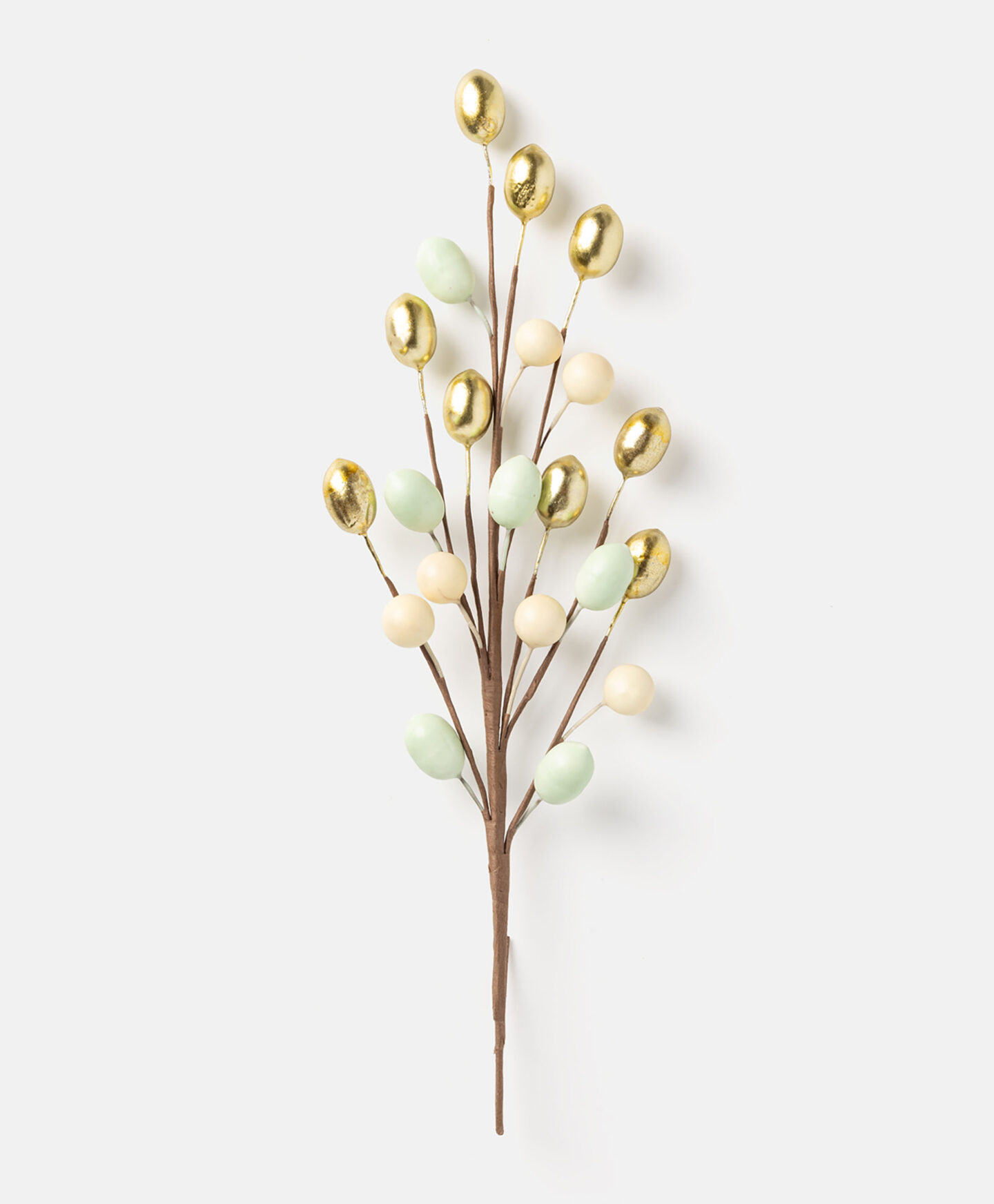 Ένα κλαδί με χρυσά πασχαλινά αυγά θα δημιουργήσει μια πασχαλινή ατμόσφαιρα σε οποιοδήποτε εσωτερικό χώρο. Ταιριάζει τόσο ως στοιχείο καλαθιού όσο και ως εορταστική διακόσμηση τραπεζιού. Τοποθετήστε το σε μια γλάστρα ή απλώστε το χαλαρά πάνω σε ένα τραπεζομάντιλο για να χαρίσετε μια ευχάριστη όψη στο πασχαλινό πρωινό σας.