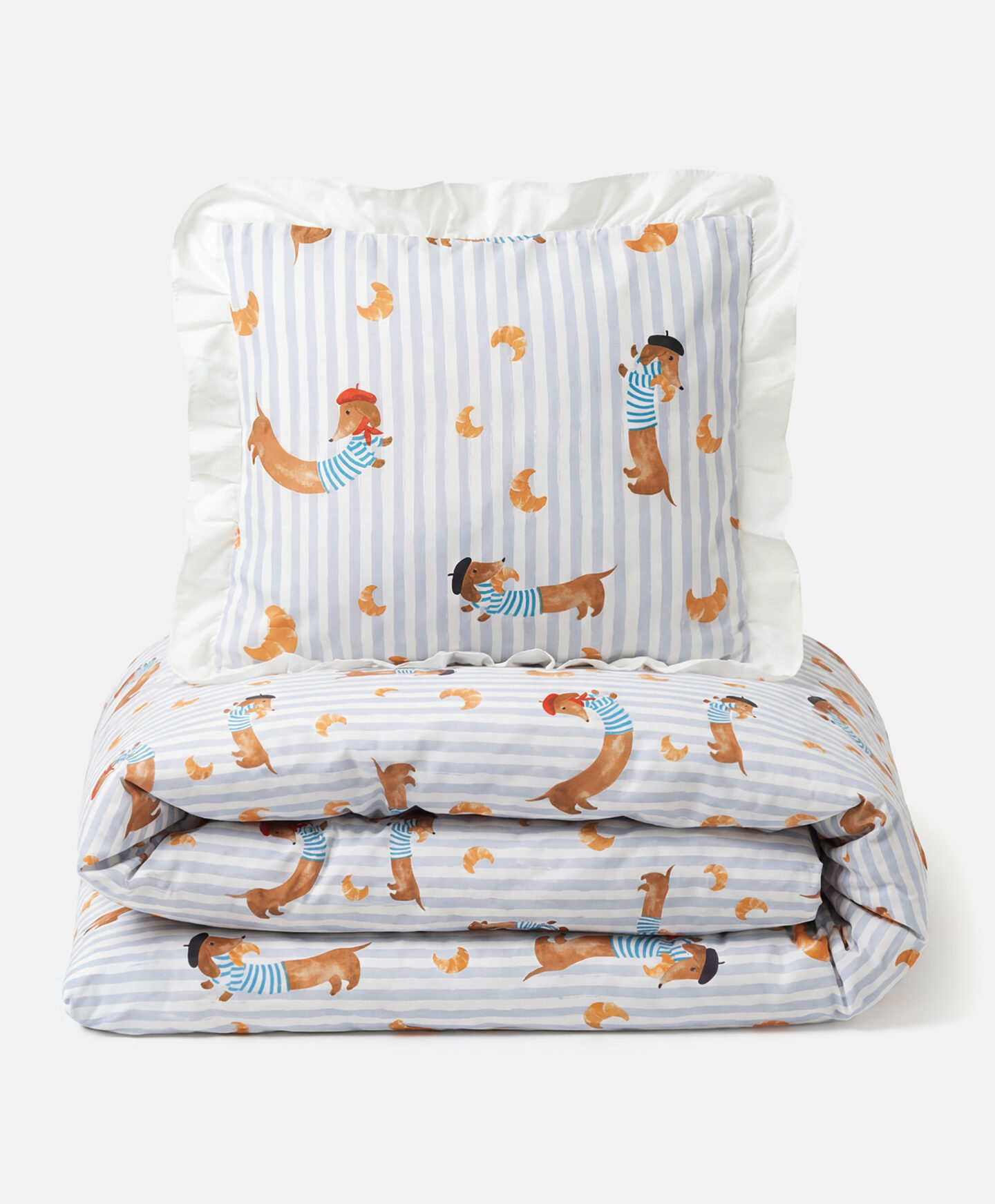 Αυτό το σετ κλινοσκεπασμάτων με σχέδιο Dachshund διαστάσεων 160×200 cm είναι ιδανικό για όσους αναζητούν κομψά κλινοσκεπάσματα για την κρεβατοκάμαρά τους. Το λευκό χρώμα σε συνδυασμό με το χαριτωμένο σχέδιο σκυλιών με μπερέ θα προσθέσει μια κομψή πινελιά σε κάθε διακόσμηση. Το σετ περιλαμβάνει ένα κάλυμμα παπλώματος 160×200 cm και δύο μαξιλαροθήκες 50×60 cm.