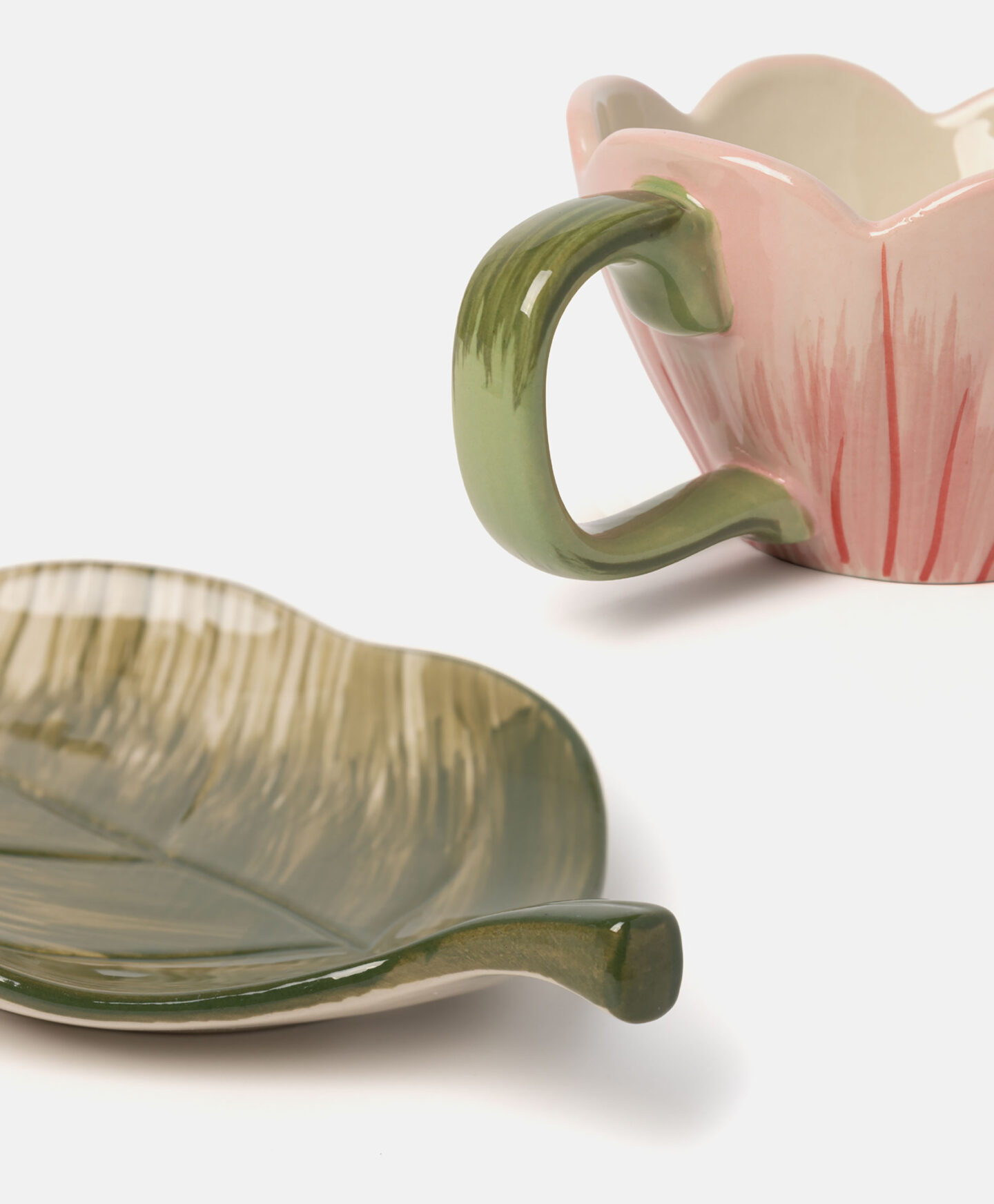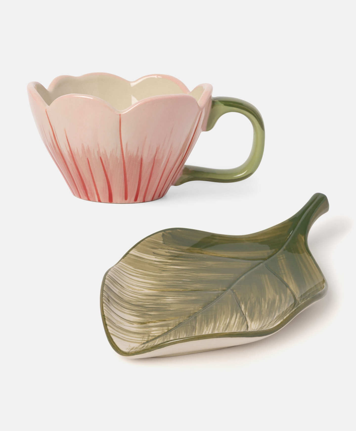 Ένα φλιτζάνι με πιατάκι σε σχήμα φύλλου γοητεύει με την προσεκτική του κατασκευή. Ο μοναδικός σχεδιασμός τραβάει το βλέμμα και κάνει το φλιτζάνι μια καλή ιδέα για δώρο σε έναν λάτρη του καφέ ή του τσαγιού. Είναι επίσης ιδανικό για καθημερινή χρήση, προσθέτοντας μια παραμυθένια νότα σε κάθε στιγμή με το αγαπημένο σας ρόφημα. Καλέστε την άνοιξη στην κουζίνα σας!