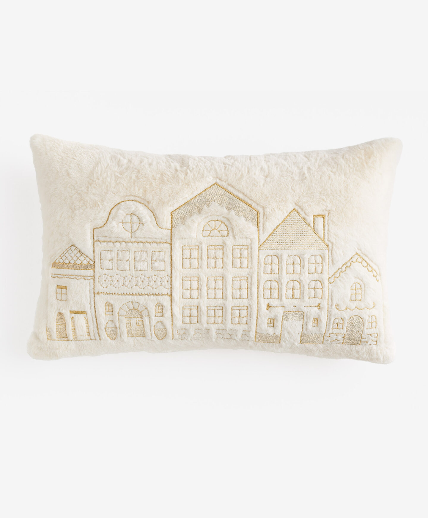 Το μαξιλάρι με σπίτια σας μεταφέρει κατευθείαν σε μια χειμερινή προκυμαία γεμάτη φώτα. Το λεπτεπίλεπτο σχέδιο των κτιρίων, διακοσμημένο με χρυσές πινελιές, προσδίδει γοητεία στο εσωτερικό και μεταμορφώνει τον καναπέ ή το κρεβάτι. Συνδυάζει τη λειτουργικότητα με τη διακόσμηση, καθιστώντας τον χώρο πιο ζεστό.
