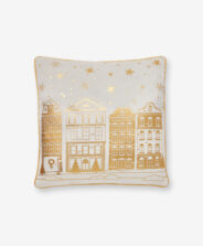 Η μαξιλαροθήκη με σπίτια είναι μια μοναδική προσθήκη που θυμίζει την Χριστουγεννιάτικη ατμόσφαιρα των ευρωπαϊκών πόλεων. Χρυσά, λαμπερά σπίτια είναι τυπωμένα σε ανοιχτόχρωμο φόντο, δίνοντας στο μαξιλάρι έναν πολυτελή και παραμυθένιο χαρακτήρα. Ιδανικό για κάθε εσωτερικό χώρο όπου επιθυμείται μια πινελιά μαγείας και ζεστασιάς. Σε συνδυασμό με άλλες χρυσές διακοσμήσεις, δημιουργεί ένα συνεκτικό και κομψό σύνολο, ενώ ο μοναδικός του σχεδιασμός το κάνει να ξεχωρίζει από άλλες μαξιλαροθήκες.