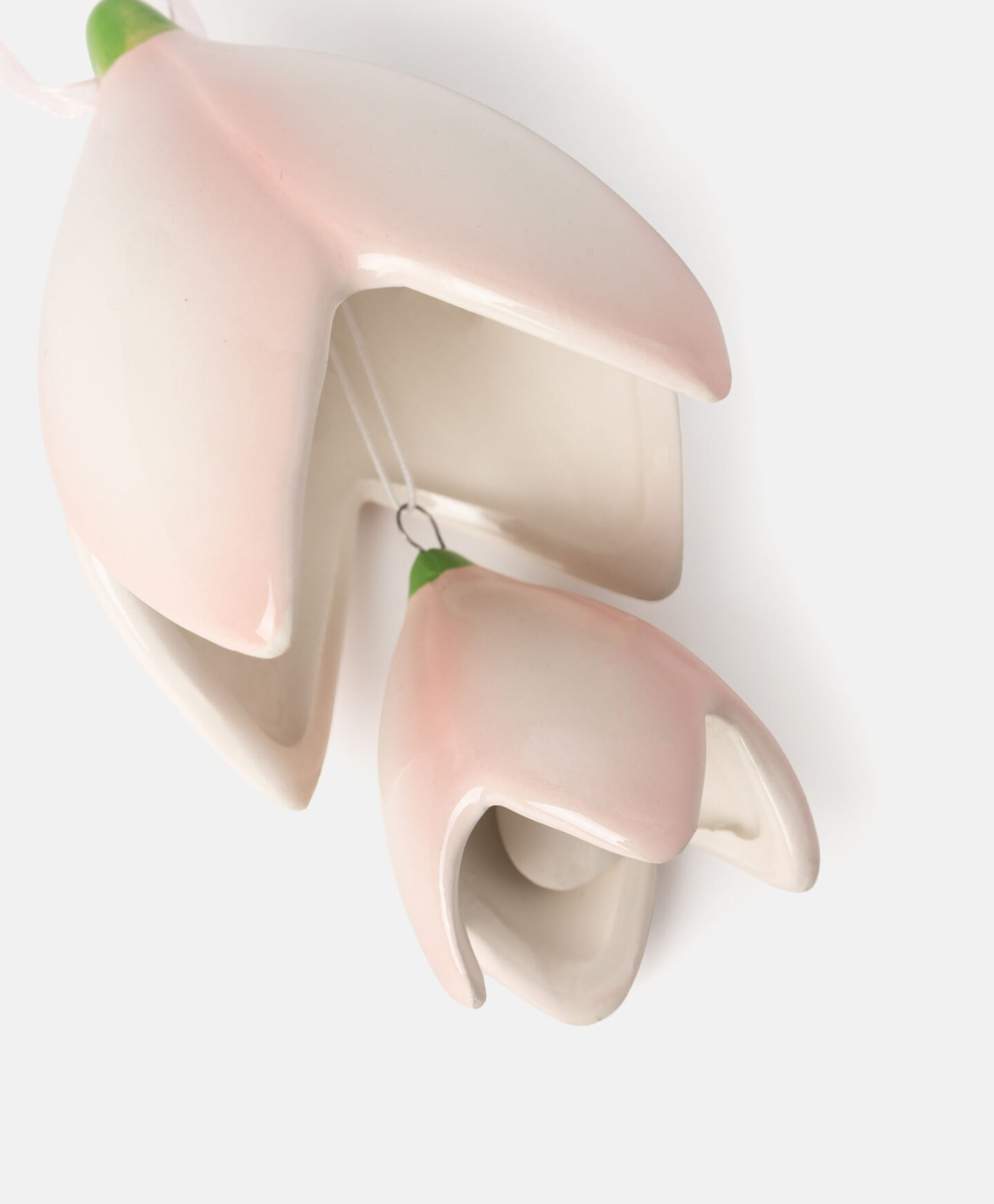 Το ροζ κρεμαστό λουλούδι συνδυάζει τον ρουστίκ χαρακτήρα της πέτρας με ένα λεπτό, καλλιτεχνικό σχέδιο εμπνευσμένο από τη φύση. Είναι ιδανικό ως διακοσμητικό στοιχείο για το εσωτερικό σας, ως κεντρικό στοιχείο για την άνοιξη ή ως μοντέρνο στολίδι για την τσάντα σας. Διατίθενται διάφορα σχέδια.