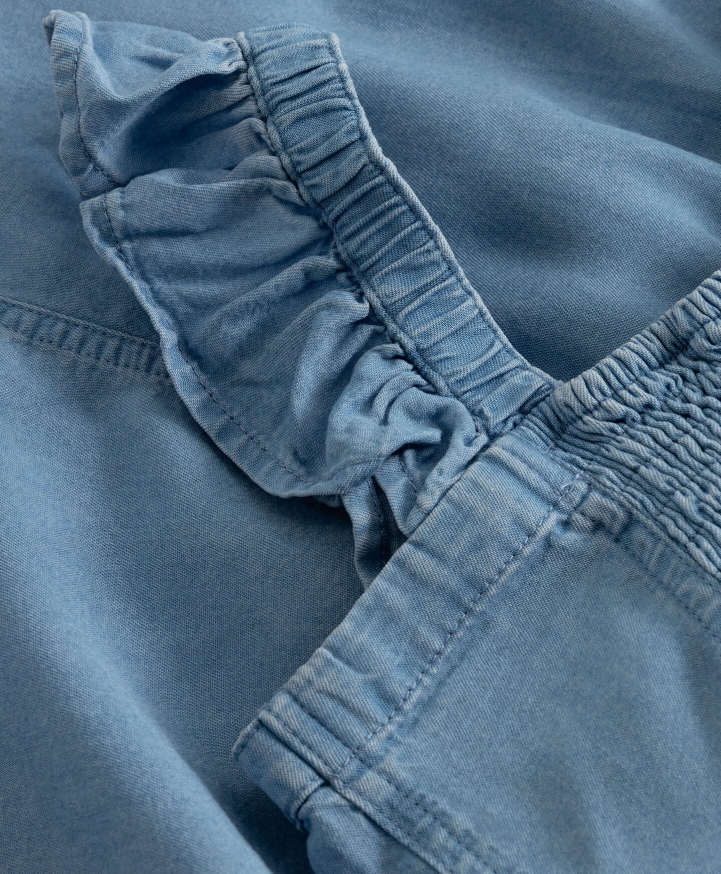Η ολόσωμη φόρμα για κορίτσια από 100% λυοσέλ είναι ένα ρούχο 2 σε 1 – απλά προσθέστε σανδάλια ή πάνινα παπούτσια και το στυλ είναι έτοιμο! Οι διακοσμητικές βολάν στις τιράντες και οι προσεκτικές ραφές είναι η επιτυχία του καλοκαιριού! Το διαχρονικό, μαλακό, ελαφρύ τζιν πέφτει όμορφα και δεν περιορίζει τις κινήσεις, ενώ η ελαστική μέση σταθεροποιεί το στυλ. Ιδανικό για βόλτες, εκδρομές και οικογενειακές συγκεντρώσεις.