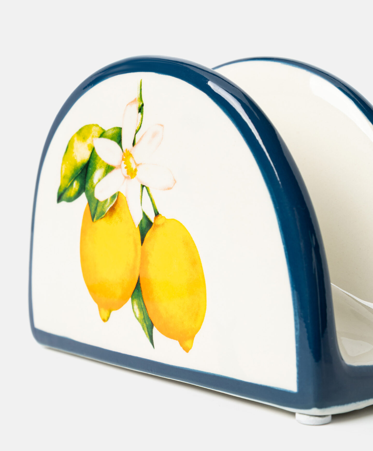 Αυτή η πετσετοθήκη από δολομίτη με σχέδιο λεμονιού είναι μια κομψή και λειτουργική προσθήκη σε οποιαδήποτε κουζίνα ή τραπεζαρία, προσφέροντας μια πινελιά καλοκαιρινής γοητείας στα καθημερινά γεύματα. Ο δολομίτης είναι ένα ανθεκτικό, ανθεκτικό στις γρατσουνιές υλικό, που εξασφαλίζει μακροχρόνια χρήση χωρίς να χάνει η πετσετοθήκη την ελκυστική της εμφάνιση. Το πλούσιο σχέδιο, εμπνευσμένο από το μεσογειακό τοπίο, είναι εντυπωσιακό και ξεχωρίζει στο τραπέζι.