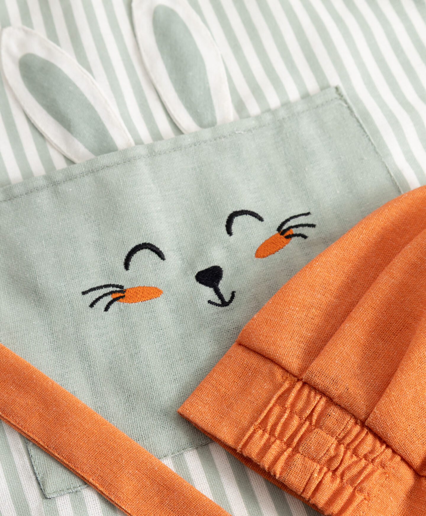 Η παιδική ποδιά κουζίνας με σχέδιο λαγουδάκι εγγυάται πολλά χαμόγελα κατά την προετοιμασία των αγαπημένων πιάτων μαζί. Το ανοιξιάτικο σχέδιο λαγουδάκι ενθαρρύνει τα παιδιά να συμμετέχουν στις δραστηριότητες της κουζίνας, ενώ το κλείσιμο με Velcro και ο δεσμός στη μέση εξασφαλίζουν τέλεια εφαρμογή. Η ποδιά είναι άνετη, ελαφριά και ανθεκτική στο πλύσιμο. Το καπέλο που περιλαμβάνεται ολοκληρώνει την ενδυμασία του μικρού σεφ.