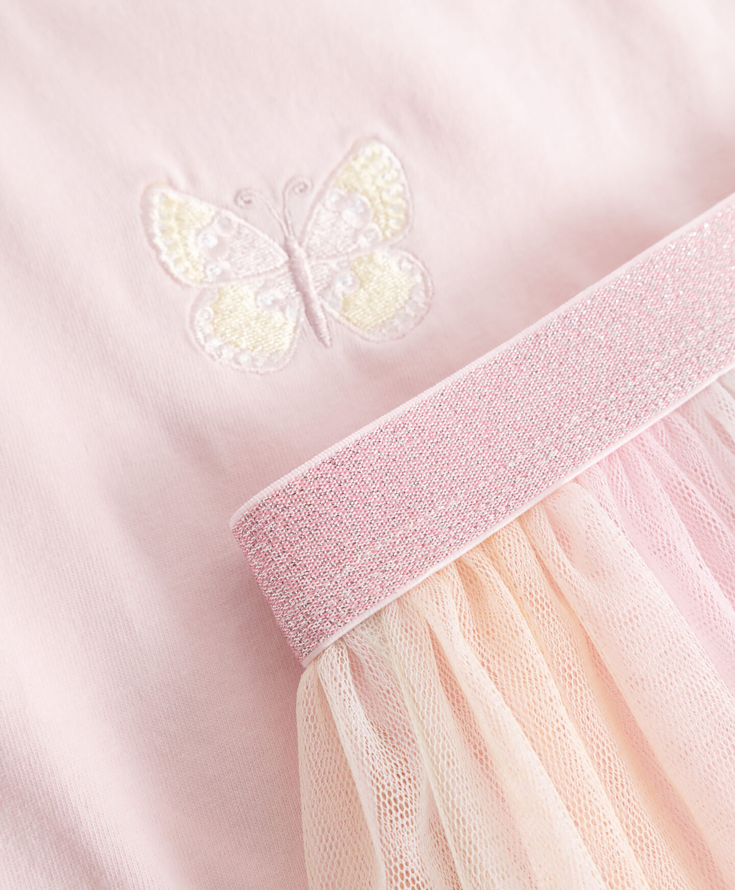 Αυτό το σετ για κορίτσια είναι τόσο αέρινο που κάθε κορίτσι θα νιώθει ελαφριά σαν πεταλούδα όταν το φοράει. Η κοντή μπλούζα με φαρδιά μανίκια και ίσια γραμμή εγγυάται ελευθερία κινήσεων. Η κεντημένη πεταλούδα στο μπροστινό μέρος προσθέτει μια πινελιά λεπτότητας. Η φούστα από ελαφρύ και αέρινο τούλι θα κυματίζει όμορφα στον άνεμο. Η άνετη ελαστική ζώνη στη μέση εξασφαλίζει τέλεια εφαρμογή.