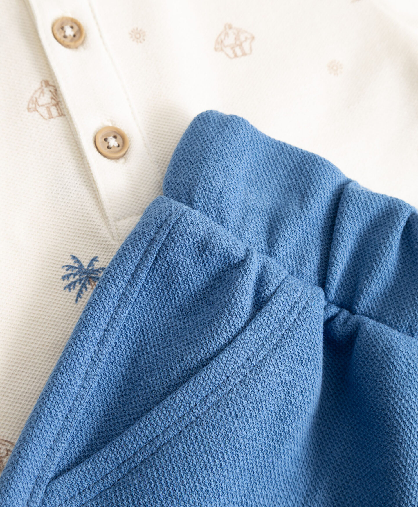 Το σετ για μωρά αγόρια συνδυάζει την κομψότητα ενός μικρού τζέντλεμαν με την άνεση. Το σετ περιλαμβάνει ένα άνετο σορτς και ένα πόλο μπλουζάκι. Το μαλακό ελαστικό ταιριάζει στην κοιλιά χωρίς να την πιέζει και κρατά το σορτς στη θέση του ακόμα και όταν το μωρό κλωτσάει έντονα. Ο σωστά σχεδιασμένος καβάλος εγγυάται χώρο για την πάνα. Το σετ περιλαμβάνει επίσης ένα πουκάμισο πόλο με πρακτικά κουμπιά κάτω από το λαιμό, που το καθιστούν εύκολο να φορεθεί. Ο μαλακός γιακάς δεν ερεθίζει το λαιμό του μωρού. Το χαριτωμένο σχέδιο αξίζει επίσης προσοχή, προσθέτοντας γοητεία στο στυλ.