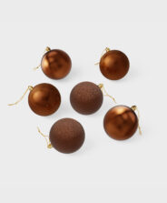 Το σετ πλαστικών στολιδιών σε καφέ χρώμα θα τονίσει τον εορταστικό χαρακτήρα του Χριστουγεννιάτικου δέντρου. Η ζεστή απόχρωσή τους προσθέτει κομψότητα στο δέντρο και δίνει σε ολόκληρη τη σύνθεση μια εξαιρετικά ζεστή ατμόσφαιρα. Πρόκειται για ένα κλασικό στοιχείο που πάντα παρουσιάζεται όμορφα ανάμεσα στα πράσινα κλαδιά.