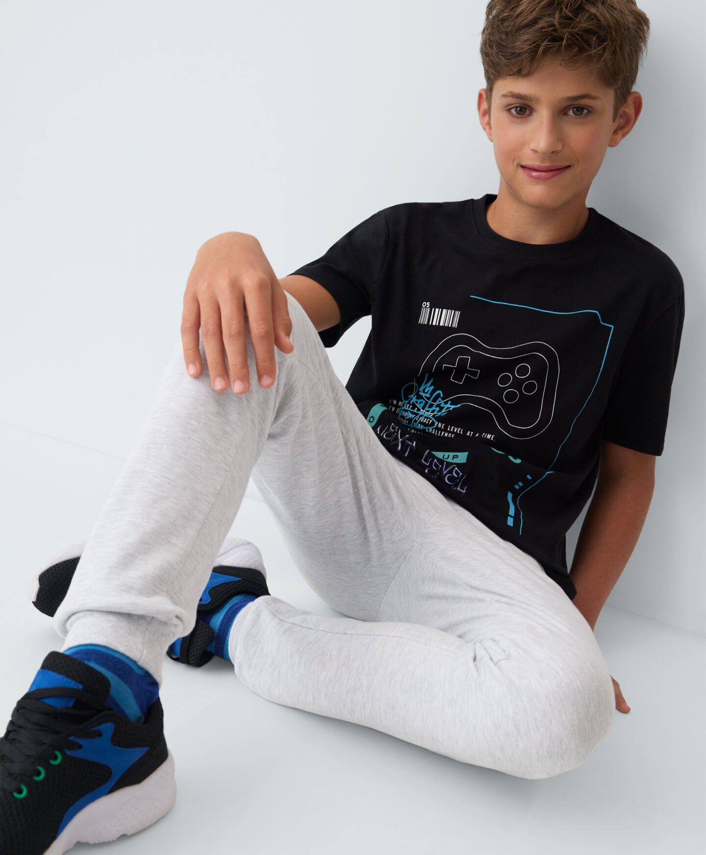 Το μαύρο κοντομάνικο t-shirt για αγόρια από 100% βαμβάκι ταιριάζει τέλεια κάτω από φούτερ ή πουλόβερ. Είναι ελαφρύ, αναπνέει και είναι απαλό στην αφή. Το σχέδιο στο μπροστινό μέρος το ξεχωρίζει από άλλα t-shirt και του προσδίδει χαρακτήρα. Είναι μια καλή επιλογή για το σχολείο, τις εξωσχολικές δραστηριότητες ή τις δραστηριότητες αναψυχής.