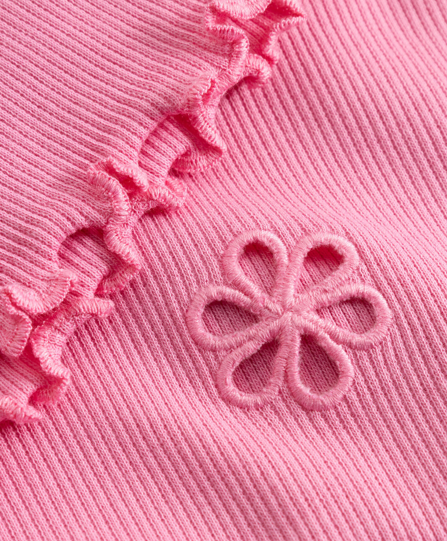 Το t-shirt για κορίτσια με ροζ κεντήματα είναι ένα απαραίτητο στοιχείο της ντουλάπας μιας μικρής κυρίας. Η υψηλή περιεκτικότητα σε βαμβάκι κάνει το υλικό απίστευτα ευχάριστο στην αφή, αναπνέει και είναι απαλό. Η κλασική γραμμή δεν περιορίζει τις κινήσεις κατά το παιχνίδι. Τα διακριτικά, ακριβή κεντήματα δίνουν στο t-shirt έναν μοναδικό χαρακτήρα, ώστε να ταιριάζει υπέροχα με τζιν, φούστα από τούλι και σορτς.